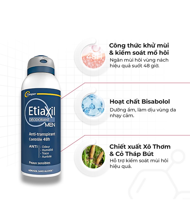 Etiaxil Men 48H là xịt khử mùi chuyên biệt dành cho nam giới, giúp ngăn mùi & kiểm soát mồ hôi hiệu quả suốt 48 giờ. Với công thức đặc biệt dành riêng cho nam giới, Etiaxil Men hút ẩm, kháng khuẩn, mang lại cảm giác khô thoáng, sạch sẽ & tự tin suốt 48 giờ.