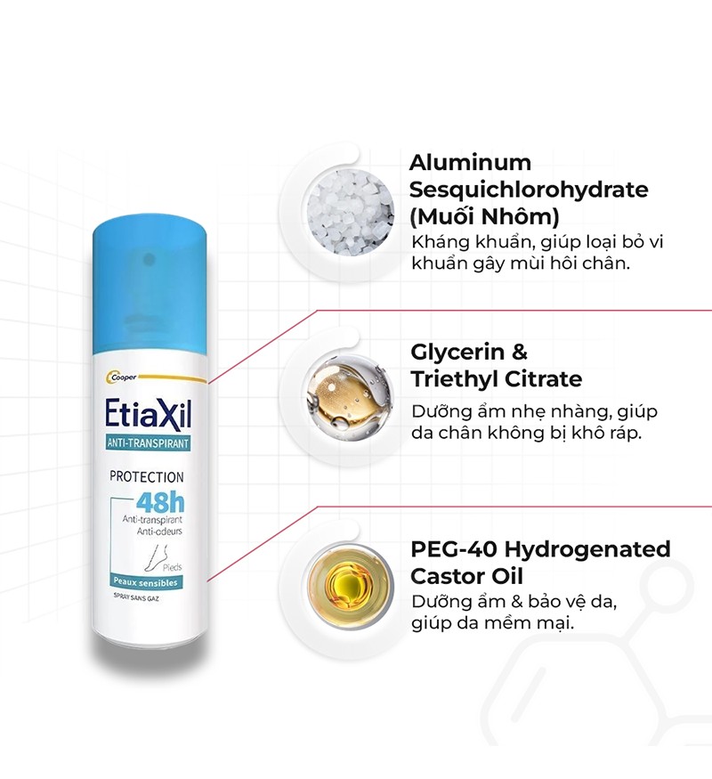 - Aluminum Sesquichlorohydrate (Muối Nhôm): Làm chậm quá trình tiết mồ hôi, kiểm soát mồ hôi hiệu quả. Kháng khuẩn, giúp loại bỏ vi khuẩn gây mùi hôi chân.