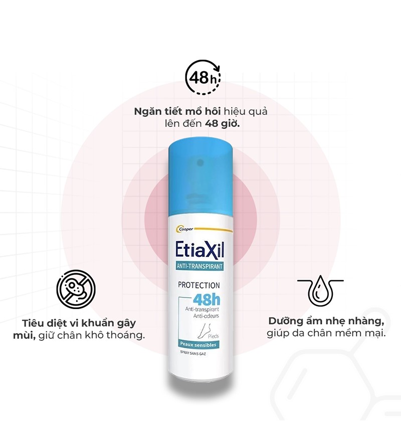 Tự tin hoạt động cả ngày dài với đôi chân “khô thoáng” Xịt khử mùi Etiaxil sẽ là "giải pháp tối ưu" giúp bạn "chấm dứt" tình trạng đôi chân ẩm ướt, mùi hôi khó chịu và cảm giác bí bách luôn khiến bạn mất tự tin. Với công thức độc đáo, sản phẩm không chỉ ngăn tiết mồ hôi hiệu quả mà còn loại bỏ mùi hôi khó chịu, mang lại cảm giác khô thoáng và tự tin suốt 48 giờ.