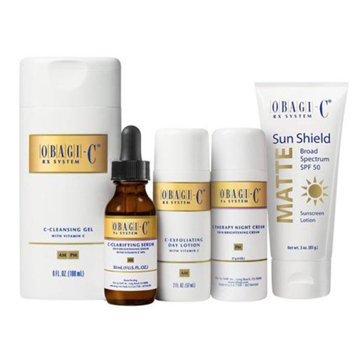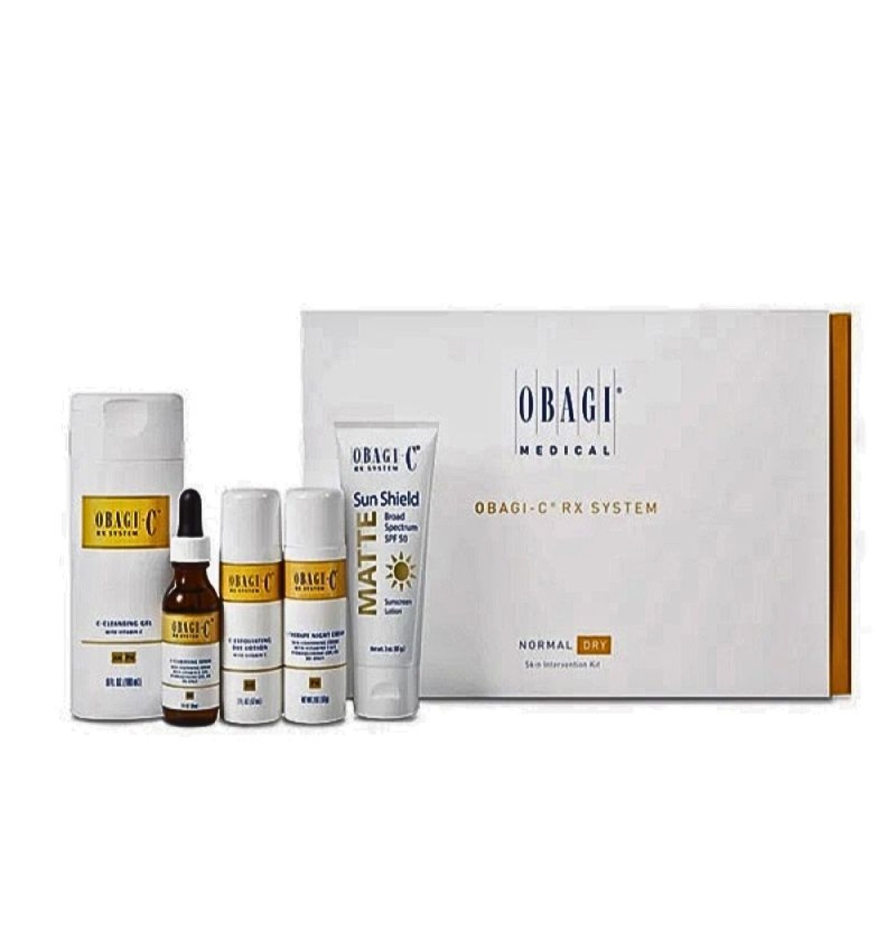 Bộ sản phẩm bao gồm 5 sản phẩm: sữa rửa mặt làm sáng da OBAGI-C RX C – Cleasing Gel, lotion dưỡng da C – Exfoliating Day Lotion, serum làm trắng da, chống lão hóa Obagi-C Rx C-Clarifying Serum – Normal To Dry, kem dưỡng ban đêm C – Therapy Night Cream và kem chống nắng Sun Shield Matte Broad Spectrum SPF 50. Obagi CRx Systems Dry Kit chứa hydroquinone 4%, axit L-ascorbic 10% (Vitamin C) và các chất chống oxy hóa mạnh mẽ, giúp kích thích tổng hợp collagen, giảm đốm sắc tố, nuôi dưỡng làn da mịn màng, tươi trẻ, tràn đầy sức sống.