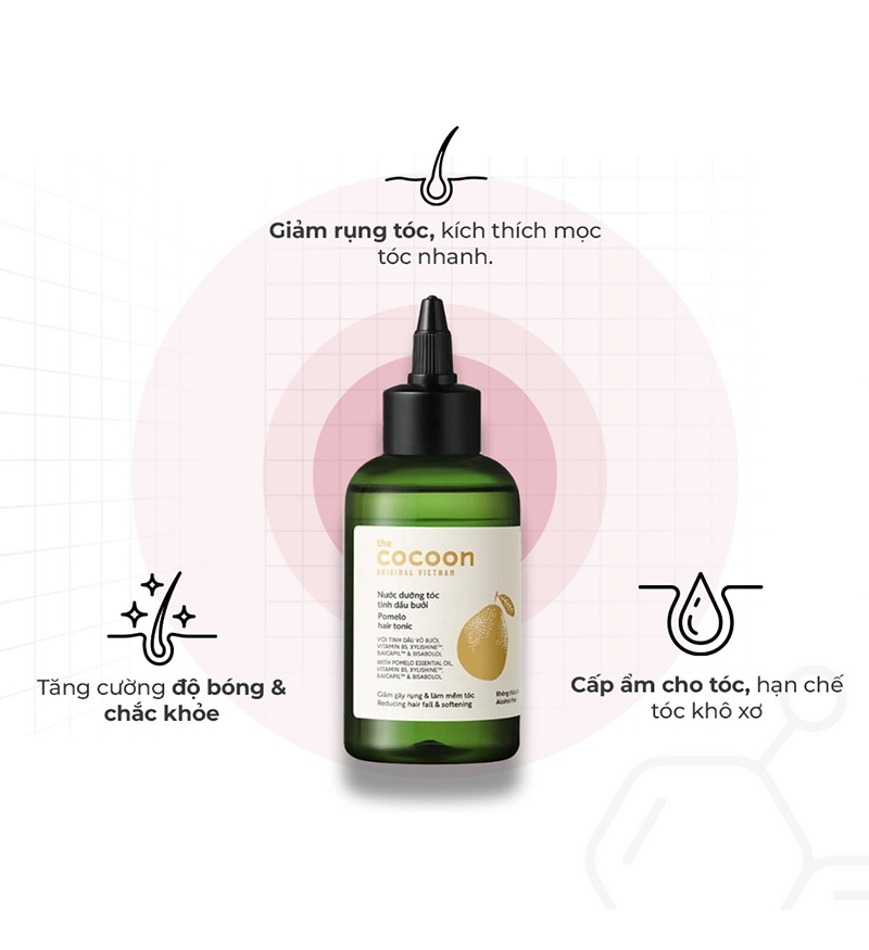 Nước dưỡng tóc tinh dầu bưởi COCOON Pomelo Hair Tonic chính là "giải pháp vàng" giúp bạn "tạm biệt" nỗi lo lắng về mái tóc thưa yếu, dễ gãy rụng và ngày càng "mỏng manh". Với thành phần chính là tinh dầu bưởi nguyên chất từ Bến Tre, sản phẩm giúp kích thích mọc tóc, giảm gãy rụng và nuôi dưỡng mái tóc từ sâu bên trong.