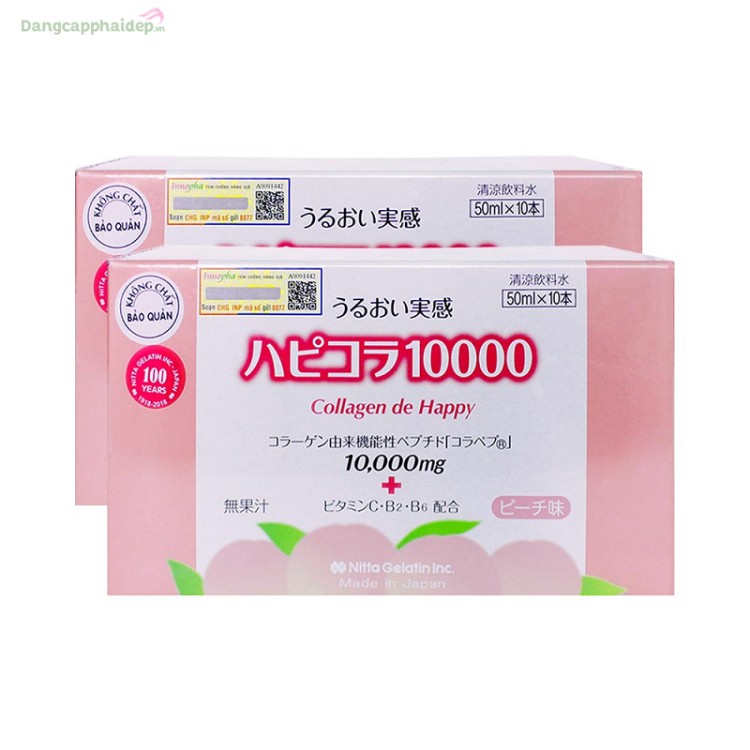 Nước uống Collagen de Happy của hãng Nitta Nhật Bản nổi tiếng có chứa đến 10000mg Collagen giúp cải thiện các dấu hiệu lão hóa như nếp nhăn, da khô sạm, chùng nhão…Lấy lại vẻ đẹp làn da căng tràn sức sống, trẻ trung.