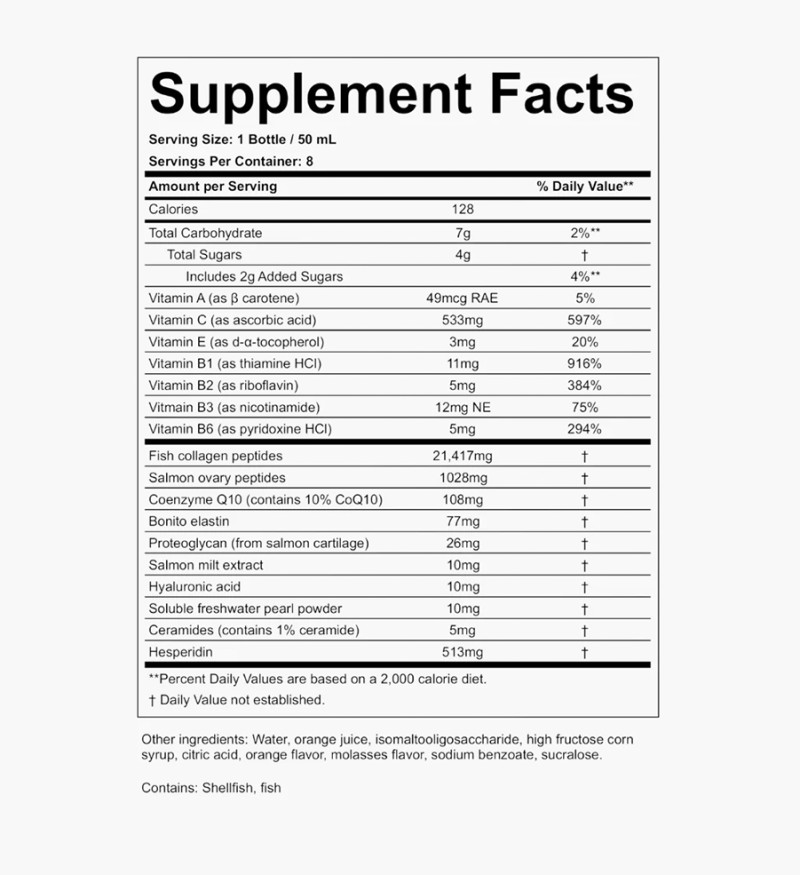 Collagen Glamore Caviar được bào chế với hàm lượng collagen tinh khiết cao nhất hiện nay (21.376,29mg/50ml), kết hợp cùng tinh chất từ xương sụn mũi cá mập, elastin từ động mạch chủ cá ngừ và đặc biệt là chiết xuất từ nhau trứng cá hồi, mang đến nguồn dinh dưỡng dồi dào cho cơ thể và làn da. Nước uống được đóng gói trong hộp 8 chai, mỗi chai 50ml, tiện lợi và dễ sử dụng. Hương vị cam tươi mát, dễ uống cũng là điểm cộng lớn của sản phẩm.
