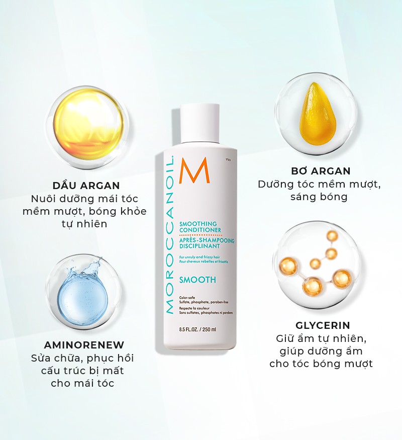 Moroccanoil Smoothing Conditioner là dòng dầu xả được tạo nên bởi công thức dưỡng ẩm và chống rối nhẹ nhàng, từ đó giúp chế ngự và làm suôn mượt mái tóc rối khó vào nếp. Thành phần AminoRenew™ độc quyền giúp phục hồi lượng axit amin bị mất để thẳng cấu trúc keratin tự nhiên của tóc từ đó giúp tóc chắc khỏe hơn.