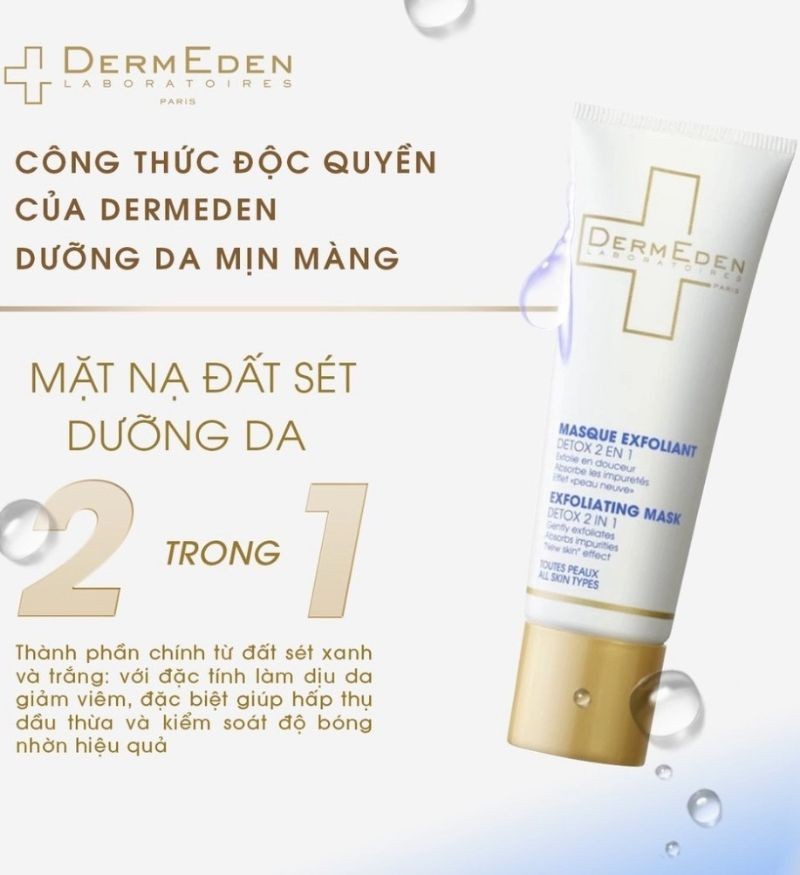 DermEden Exfoliating Mask Detox 2in1 được nghiên cứu và phát triển bởi DermEden Laboratoires, mặt nạ này mang đến quy trình chăm sóc da chuyên sâu tại nhà, giúp da lấy lại vẻ tinh khiết và rạng rỡ.