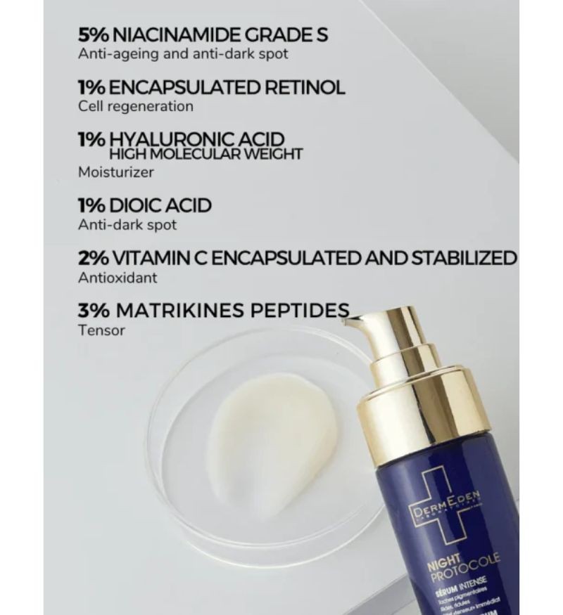 DermEden Night Protocole Intense Serum là một siêu huyết thanh ban đêm đến từ Pháp của thương hiệu DermEden Laboratoires, được bào chế dưới sự giám sát của các bác sĩ da liễu, với mục tiêu tận dụng thời điểm vàng – ban đêm – để kích hoạt quá trình phục hồi và tái tạo sâu trong da. Công thức mạnh mẽ chứa đến 14.5% hoạt chất chống lão hóa đã được kiểm nghiệm lâm sàng, tác động trực tiếp đến các vấn đề như nếp nhăn, da chảy xệ, đốm sắc tố và mất nước.
