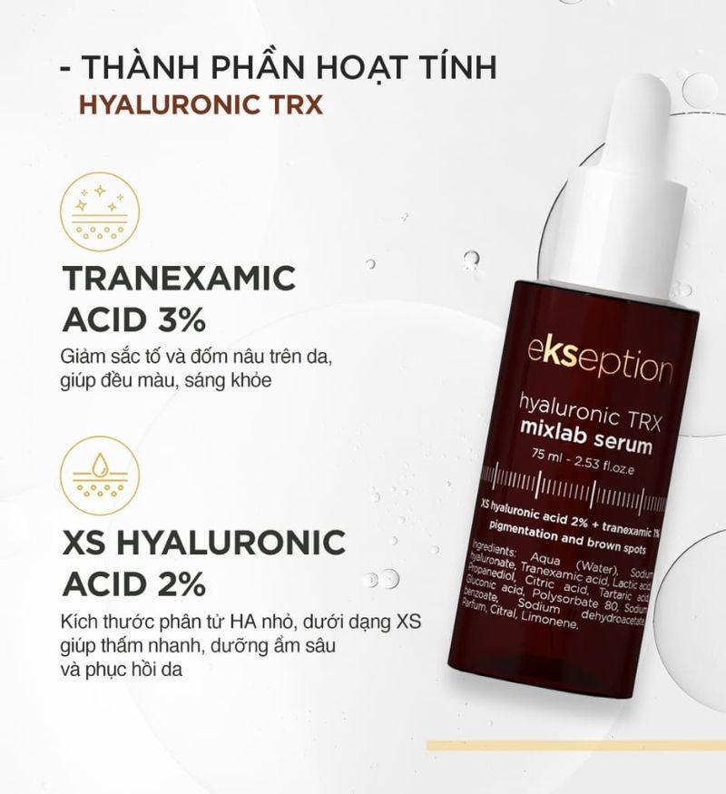 Serum Ekseption Hyaluronic TRX được bào chế với thành phần chính là Tranexamic acid mang đến hiệu quả làm trắng, giảm sắc tố, hỗ trợ làm mờ đốm đen. Tranexamic acid ức chế hoạt động của plasmin, từ đó giảm arachidonic acid (AA) tự do và giảm sản xuất Protagladine (một chất kích thích hoạt tính của tyrosinase). Điều này có nghĩa, TRX ức chế Tyrosinase và từ đó ức chế sự tổng hợp melanin. Từ đó làm giảm độ nhạy cảm, phục hồi hàng rào bảo vệ da và cải thiện tình trạng sạm nám, da đều màu nhanh chóng.