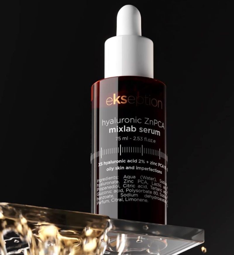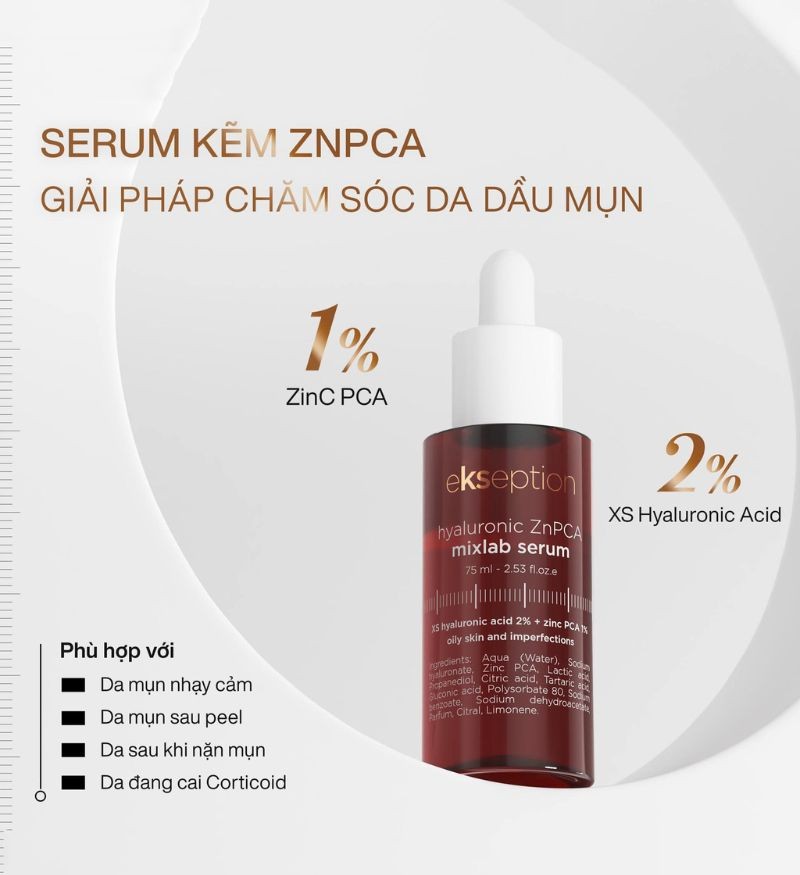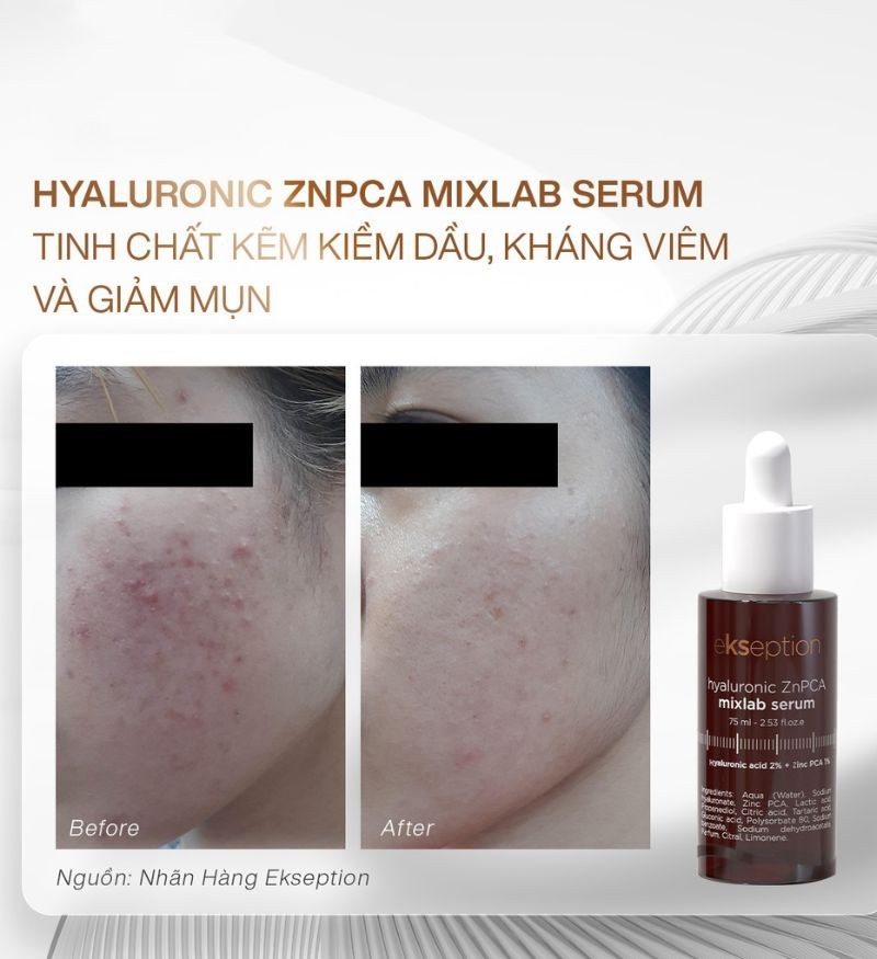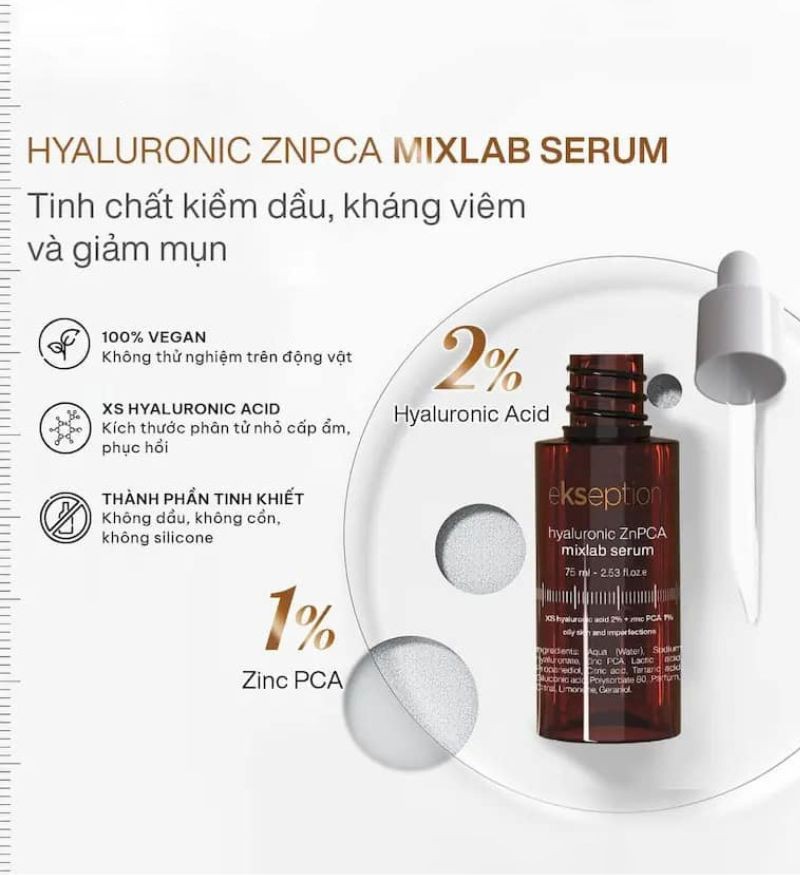 Ekseption Hyaluronic ZNPCA Mixlab Serum là tinh chất trị mụn, kiểm soát dầu ứng dụng kẽm với L-pyrrolidone carboxylic axit (L-PCA), một phân tử sinh lý tự nhiên có vai trò cơ bản trong quá trình sinh hóa của da. Sự kết hợp giữa Zinc và L-PCA giúp kiểm soát mụn trứng cá, giảm tiết bã nhờn, đồng thời giữ ẩm cho da và tăng cường hàng rào bảo vệ da.