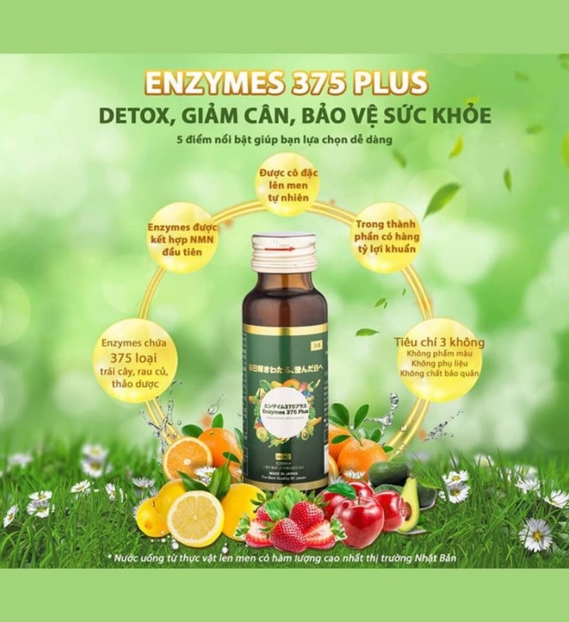 Enzymes 375 Plus là một sản phẩm nước detox giảm cân hàng đầu từ Nhật Bản, được chiết xuất từ 375 loại rau, củ, quả và thảo dược lên men tự nhiên. Sản phẩm này không chỉ cung cấp chất xơ, vitamin và khoáng chất cho cơ thể mà còn hỗ trợ tiêu hóa, giảm hấp thụ chất béo, giúp thải độc cơ thể và cải thiện sức khỏe toàn diện.