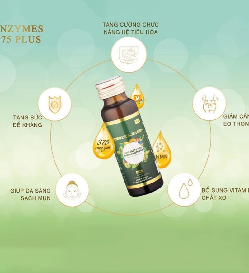 Đặc biệt, Enzymes 375 Plus kết hợp với NMN và Fucoidan – những thành phần quý giá được coi là “thần dược” cho sức khỏe. NMN giúp trẻ hóa tế bào và tăng cường tuổi thọ, trong khi Fucoidan tăng cường hệ miễn dịch và phòng ngừa ung thư. Nước uống detox Enzymes 375 Plus còn giúp giải nhiệt cơ thể, làm đẹp da, chống lão hóa, cải thiện sức khỏe đường ruột, hỗ trợ hệ tim mạch, và tăng cường trao đổi chất. Với những công dụng toàn diện này, Enzymes 375 Plus là sự lựa chọn lý tưởng cho những ai mong muốn giảm cân và duy trì sức khỏe một cách tự nhiên và an toàn