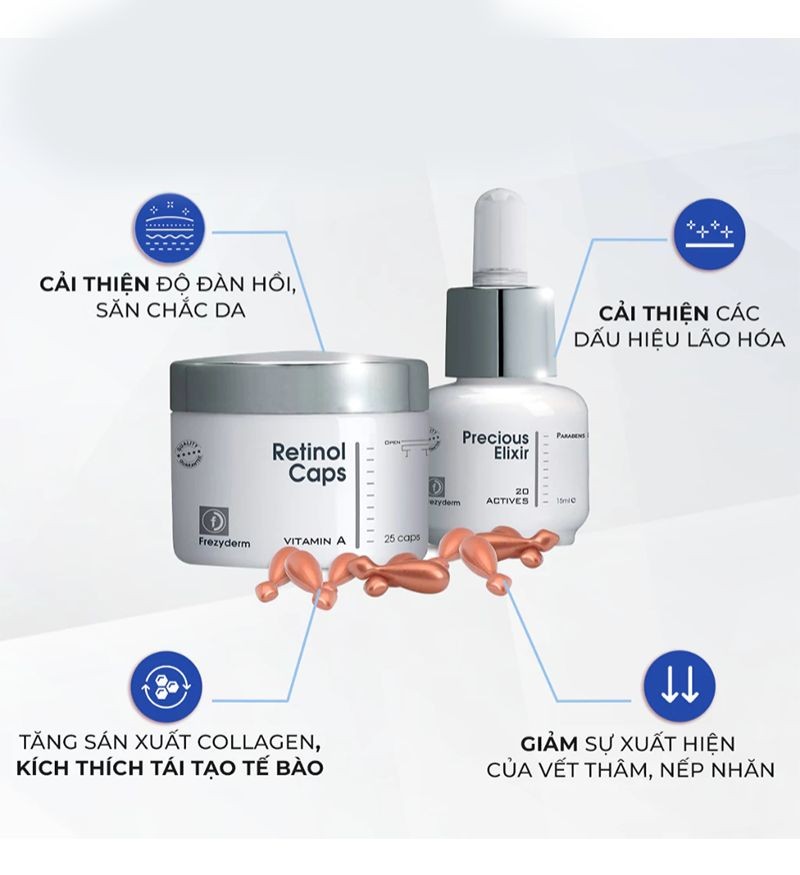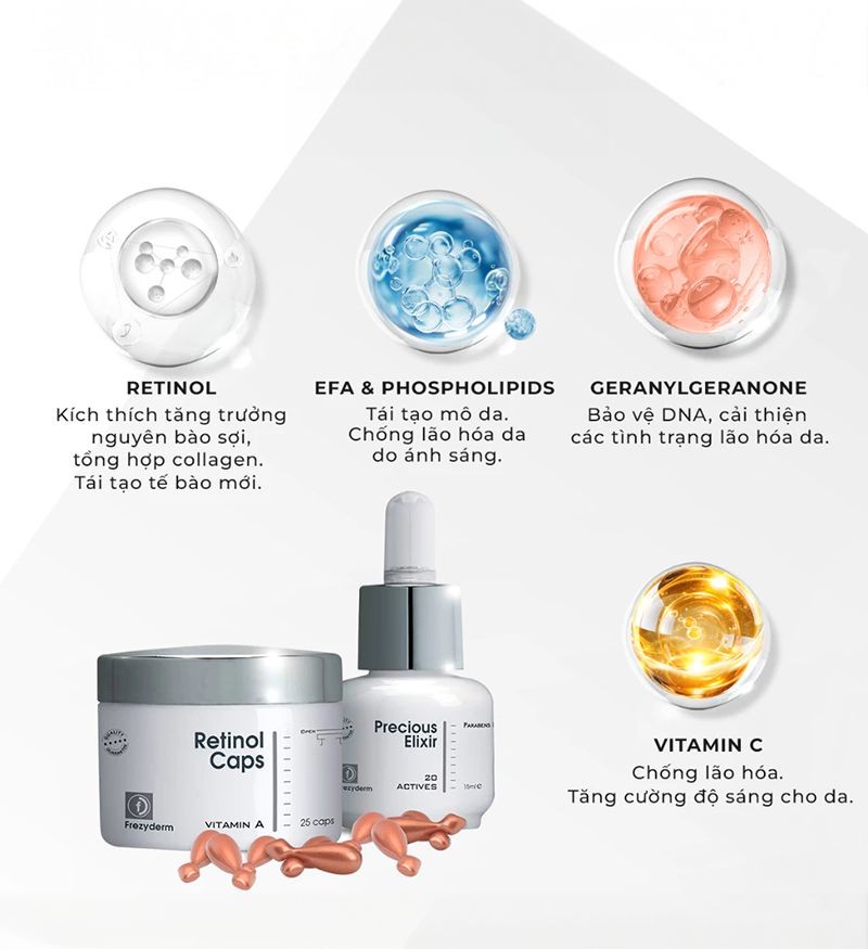 Frezyderm Age Repair Set là bộ sản phẩm Retinol cao cấp, mang lại giải pháp toàn diện trong việc trẻ hóa và phục hồi làn da. Với sự kết hợp độc đáo giữa Retinol 0.2% và Retinyl Palmitate 4.5%, sản phẩm giúp tái cấu trúc da, làm dày lớp biểu bì và cải thiện đáng kể độ đàn hồi của da. Đặc biệt, công thức chứa hỗn hợp vitamin, acid béo thiết yếu và phospholipid không chỉ cung cấp dưỡng chất mà còn tăng cường hàng rào bảo vệ da, giữ cho làn da khỏe mạnh, mịn màng.