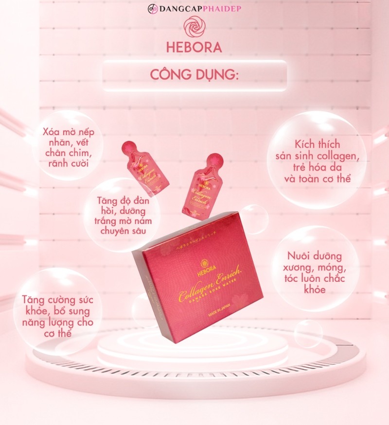 Hebora Collagen Enrich Damask Rose Water là sản phẩm thuộc thương hiệu đình đám Hebora - Nhật Bản. Sản phẩm được làm giàu với những thành phần chất lượng, tinh túy từ thiên nhiên như Collagen Peptide chiết xuất từ da và vây cá biển sâu Thái Bình Dương, cánh hồng Damask, Enzyme thực vật từ 112 loại trái cây,...Mang đến hiệu quả ưu việt trong việc nuôi dưỡng tế bào, kích thích tăng sinh collagen tự nhiên. Giúp “chặn đứng” lão hóa, gia tăng đàn hồi, làm trắng da, detox mùi cơ thể. Song song đó là tăng cường sức khỏe, giúp cơ thể dẻo dai, tràn đầy sức sống. Từ đó, cho bạn một sắc vóc hoàn hảo từ trong ra ngoài.