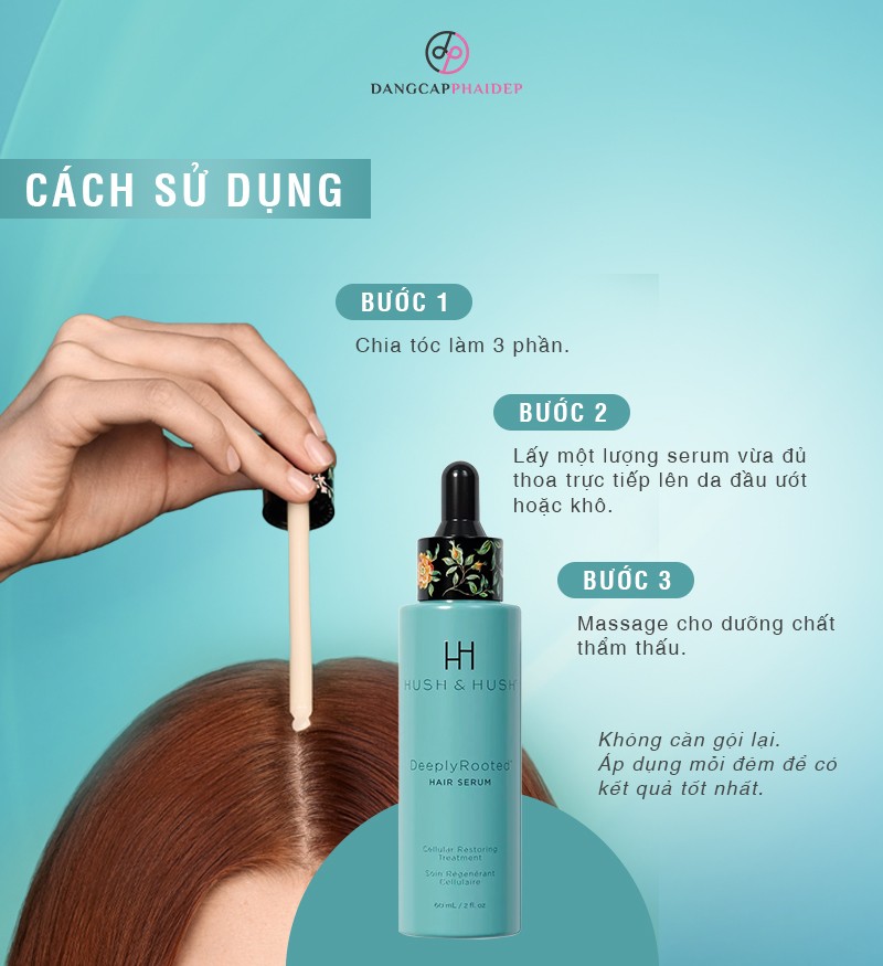 Hush and Hush DeeplyRooted Hair Serum gia tăng 78% sự phát triển của mái tóc. Giảm 33,3% lượng tóc rụng trong quá trình thử kéo (chải). Thúc đẩy quá trình tái tạo nang tóc trở nên khỏe mạnh hơn rõ rệt. Hush and Hush DeeplyRooted Hair Serum là sản phẩm của thương hiệu Hush & Hush. Đây là thương hiệu nổi tiếng hàng đầu tại Mỹ với các sản phẩm chăm sóc mái tóc, làn da và hỗ trợ cải thiện sức khoẻ.