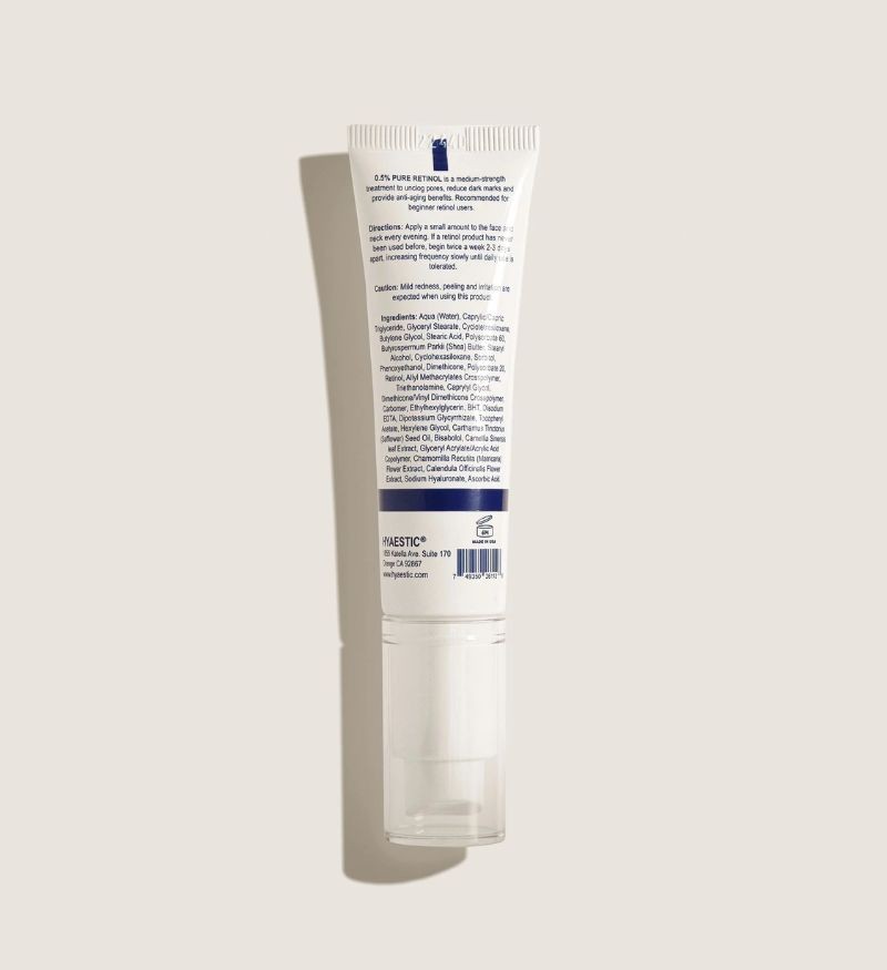 Tinh chất chống lão hóa Hyaestic 0.5% Pure Retinol chứa 0.5% Retinol (một trong các dẫn xuất của vitamin A) có khả năng thúc đẩy quá trình bong da, tăng tốc độ tái tạo tế bào, kích thích tăng sinh collagen để cải thiện độ đàn hồi, săn chắc cho da. Đồng thời ngăn ngừa quá trình da lão hóa, giúp giảm xuất hiện các nếp nhăn, giảm tình trạng da xỉn màu, giúp làn da sáng đều màu hơn.
