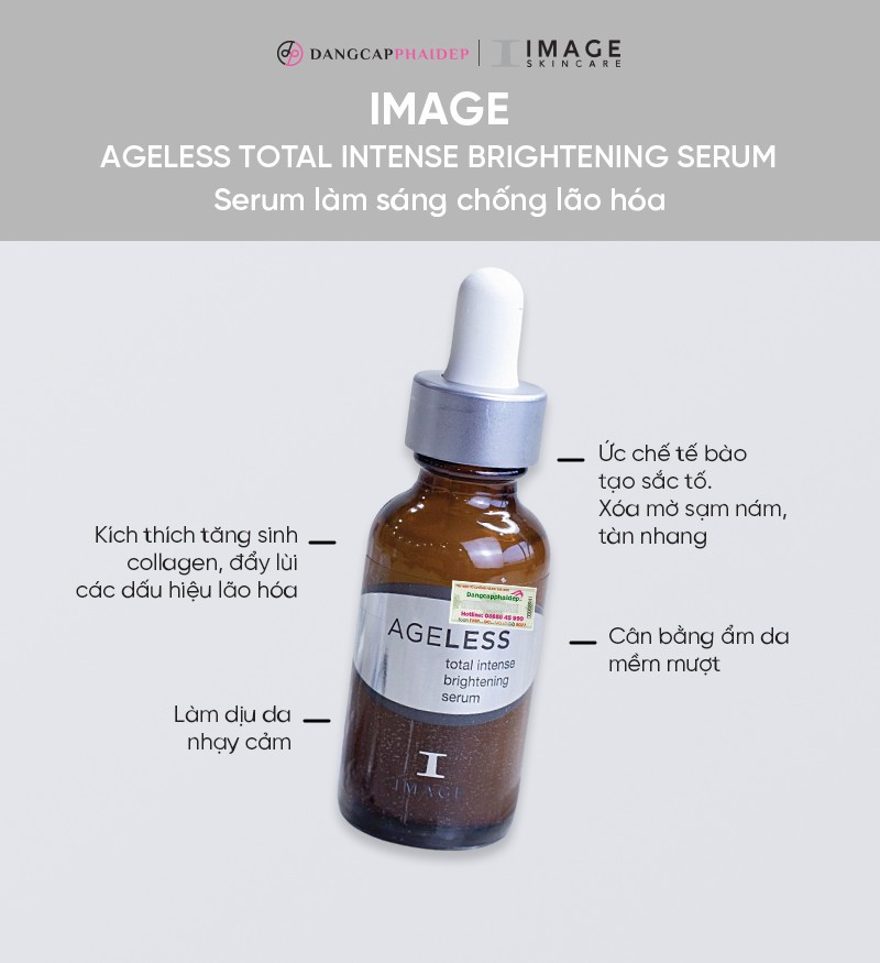 Image Ageless Total Intense Brightening Serum với bảng thành phần mạnh mẽ. Mang đến hiệu quả cải thiện các vết nám, tàn nhang rõ rệt sau 6 - 8 tuần sử dụng đều đặn. Thuộc Image Ageless - Dòng sản phẩm chống lão hóa da nổi tiếng do hãng Dược mỹ phẩm Image Skincare sản xuất. Bộ sản phẩm này được nghiên cứu bởi các chuyên gia, đội ngũ bác sĩ da liễu và dược sĩ hàng đầu Châu Âu.