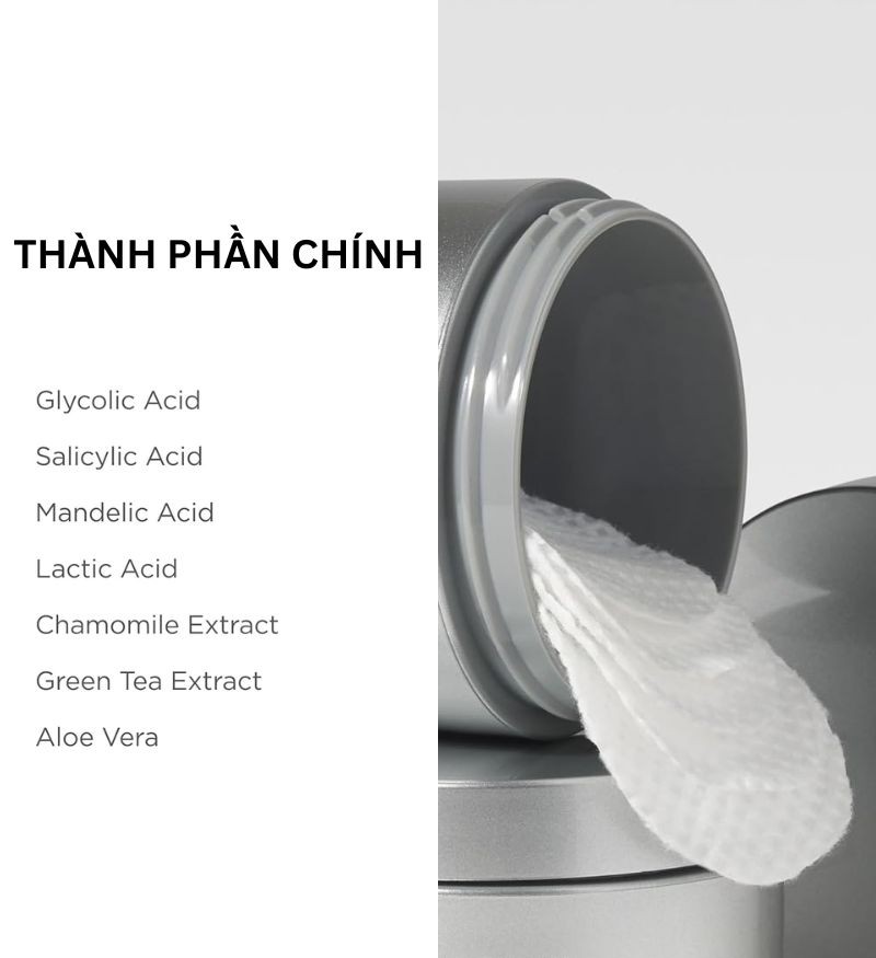 Bên cạnh khả năng tái tạo mạnh mẽ, sản phẩm còn được bổ sung các chiết xuất từ thiên nhiên như trà xanh, hoa cúc và lô hội đảm bảo quá trình tái tạo diễn ra êm dịu, mang lại cảm giác tươi mát cho làn da. Với thiết kế dạng miếng pad tiện lợi, được thấm sẵn dưỡng chất giúp các hoạt chất thẩm thấu đồng đều, tối ưu hóa hiệu quả làm sáng và cải thiện kết cấu da thô ráp. Từ đó giúp duy trì sức khỏe làn da, mang lại bề mặt da mịn màng, căng bóng và vẻ ngoài rạng rỡ đầy sức sống.
