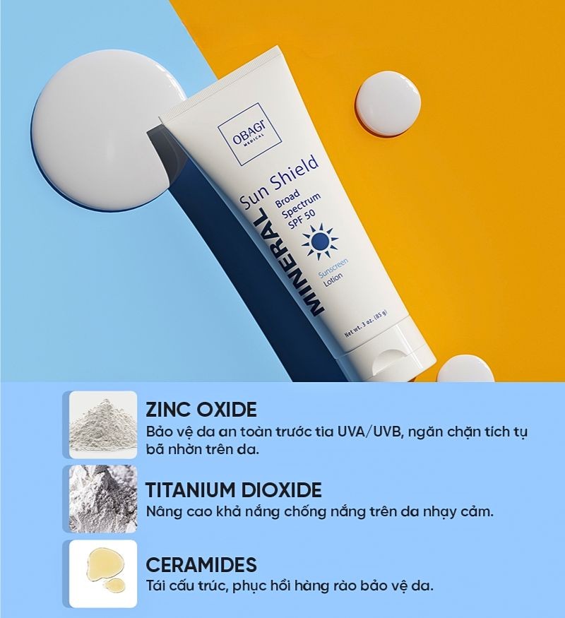 Obagi Sun Shield Mineral Broad Spectrum SPF 50 là dòng kem chống nắng vật lý, được bảo chế 100% từ khoáng thiên nhiên lành tính như Zinc Oxide, Titanium Dioxide, chiết xuất tảo, vitamin E, sở hữu công nghệ chống nắng tiên tiến giúp chống UVA/UVB, kháng tia hồng ngoại IR hiệu quả. Đồng thời nhờ công nghệ Zinc Invisible giúp làn da khô thoáng, không làm tắc nghẽn lỗ chân lông.