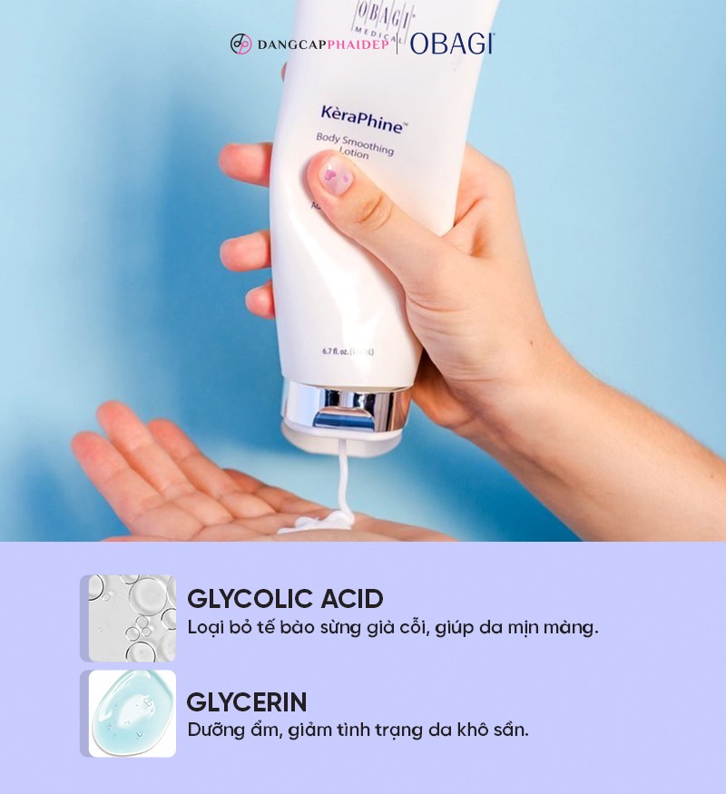 Obagi Kèraphine Body Smoothing Lotion 198g là kem dưỡng thể đến từ thương hiệu dược mỹ phẩm Obagi Medical - Mỹ, nổi tiếng với hiệu quả loại bỏ tế bào chết và dưỡng ẩm chuyên sâu.