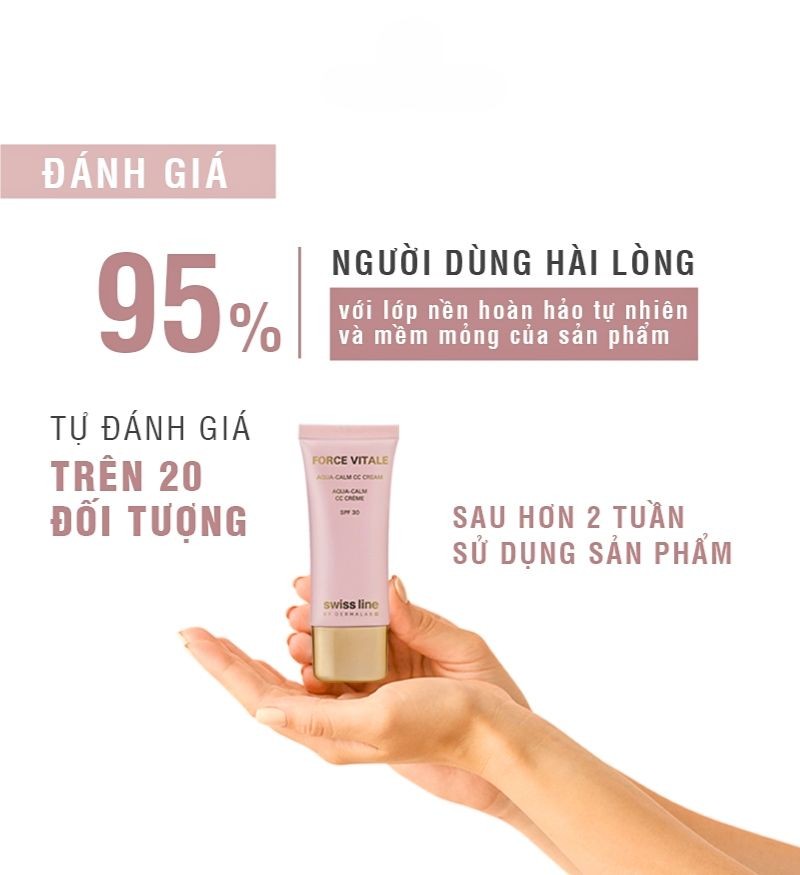 Aqua - Calm CC Cream SPF30 Beige 10 nằm trong dòng Force Vitale nổi tiếng của thương hiệu Swissline với khả năng vượt trội trong việc giải quyết tình trạng mất nước, nhạy cảm và dầu nhờn của da.