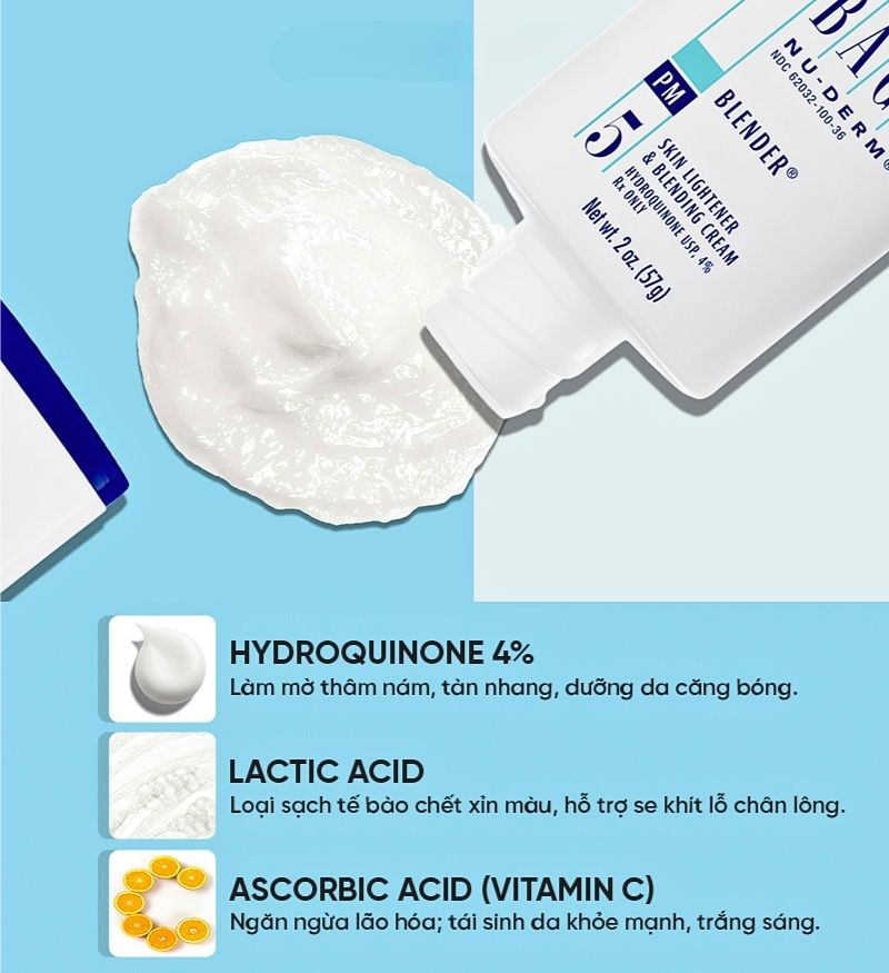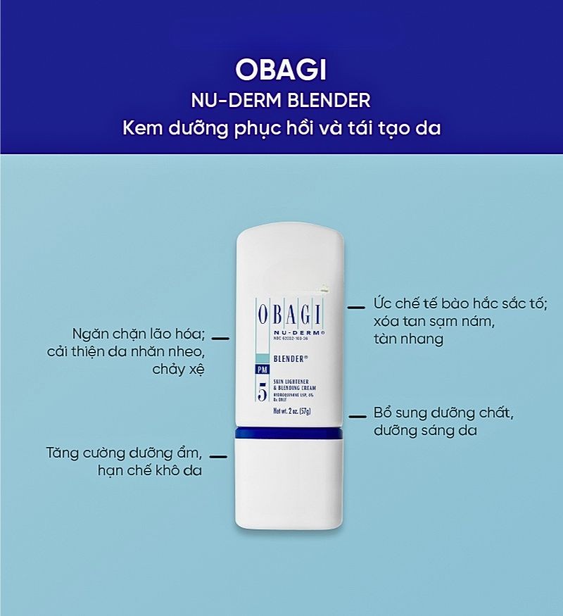 Nu-Derm Blender (Obagi số 5) là dòng kem dưỡng phục hồi tái tạo da cao cấp của thương hiệu dược mỹ phẩm Obagi Medical – Mỹ (thành lập năm 1988 bởi bác sĩ Zein E. Obagi) nằm trong hệ thống điều trị nám Nuderm System. Sản phẩm chứa thành phần Hydroquinone đảm nhận vai trò ức chế tận gốc tế bào sắc tố, làm mờ sạm nám, làm cho màu sắc làn da tươi sáng hơn.