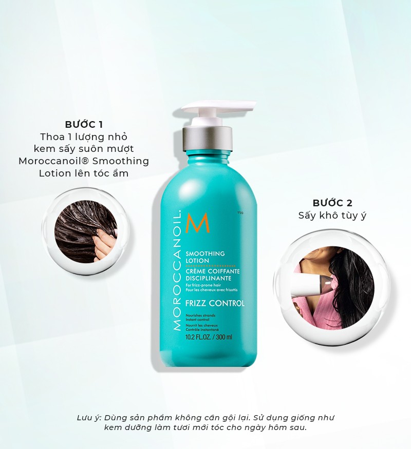 Kem sấy suôn mượt Moroccanoil Smoothing Lotion giúp giữ nếp và định hình tóc vừa phải, giúp mái tóc suôn mượt, dễ chải ngay sau lần sử dụng đầu tiên. Để sử dụng hiệu quả, đừng quên thực hiện đầy đủ các bước sau đây: