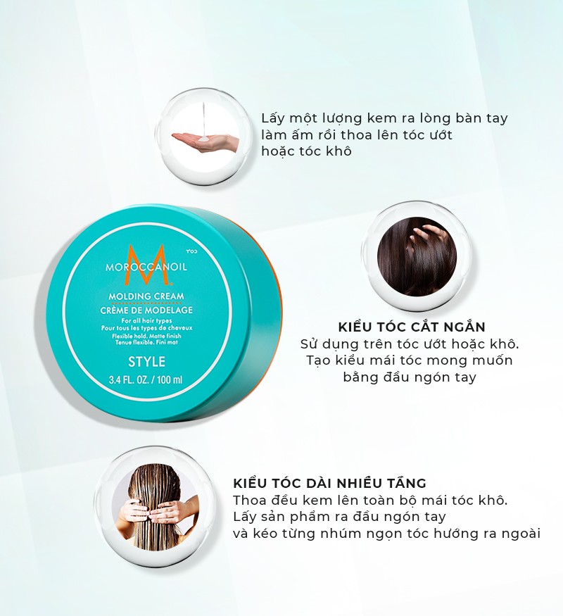 Kem tạo nếp tóc Moroccanoil Molding Cream định hình kiểu tóc dễ dàng, giúp tạo hiệu quả bóng mờ cho mái tóc óng ả đầy sức sống hơn. Để sử dụng hiệu quả kem tạo nếp cần thực hiện đầy đủ các bước sau: