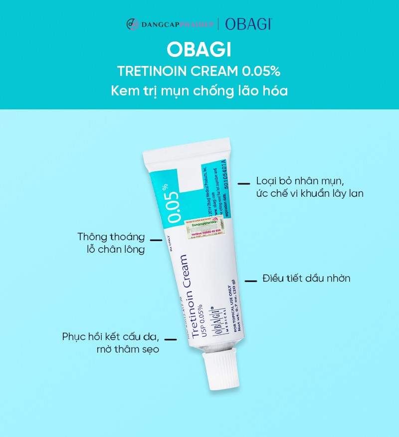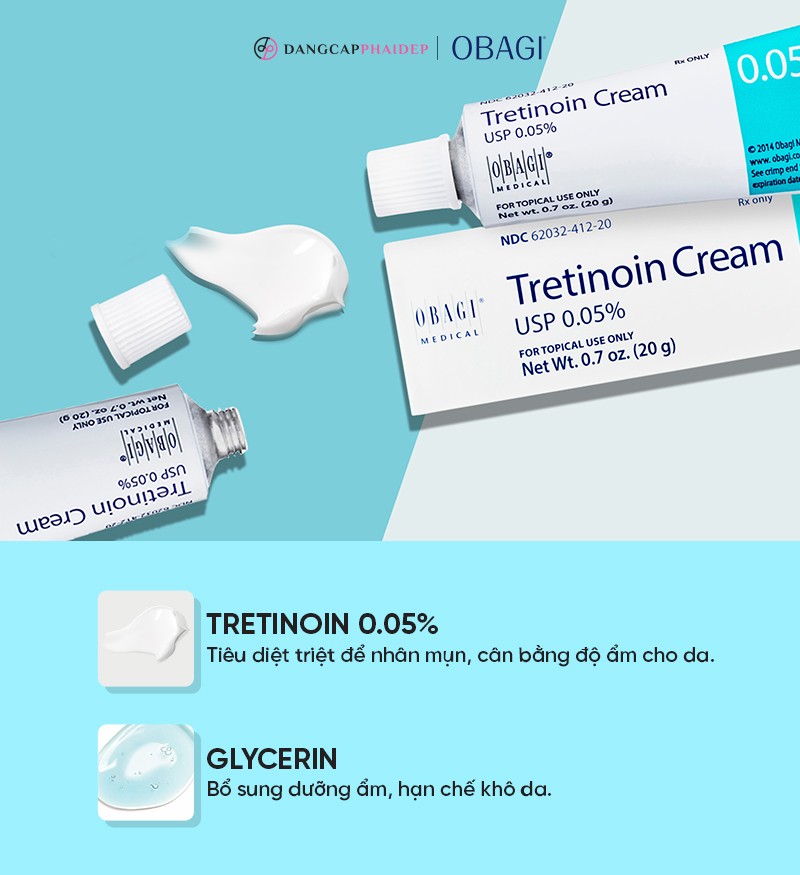 Kem trị mụn, chống lão hóa da Obagi Tretinoin Cream 0.05% của nhà Obagi Medical chứa Tretinoin và Axit Retinoic giúp tiêu diệt tận gốc những đốm mụn, hỗ trợ kháng viêm, chống khuẩn; giúp đẩy lùi sạm nám, chăm sóc làn da khỏe mạnh, trắng sáng và mịn màng hơn.