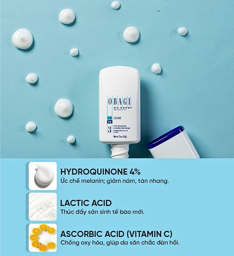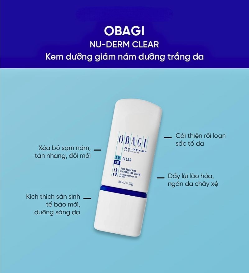 Kem trị nám Obagi Nuderm Clear (Obagi số 3 giải quyết triệt để làn da sạm nám, tàn nhang…) trả lại vẻ trắng sáng rạng rỡ cho da chỉ trong thời gian ngắn nhất. Sản phẩm trị nám của thương hiệu Obagi Medical là bước thứ 3 trong hệ thống tái tạo da của hệ thống Nu-Derm Syste. Đây được xem là bước chăm sóc da cực kì quan trọng. Giúp cải thiện nhanh chóng tình trạng da sạm nám, đốm nâu, tàn nhang…Đồng thời cân bằng lại màu sắc da không đồng đều, giúp làn da mịn màng và tươi sáng tự nhiên nhờ sự kết hợp của 4% Hydroquinone, Glycerin, Lactic Acid, Vitamin C, Alpha hydroxy acid (AHA)..