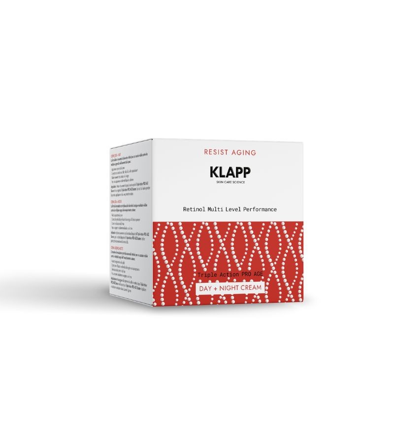 Klapp Retinol Triple Action Pro Age Day + Night Cream là kem dưỡng chống lão hóa thuộc dòng Retinol của Klapp Skin Care Science (Đức), được phát triển để chăm sóc làn da có dấu hiệu nếp nhăn, kém đàn hồi, da thô ráp và đường nét gương mặt thiếu săn chắc. Sản phẩm hoạt động xuyên suốt ngày và đêm, giúp hỗ trợ tái tạo da, đồng thời giảm tình trạng mất nước nhờ hệ dưỡng ẩm và phục hồi hàng rào bảo vệ da.