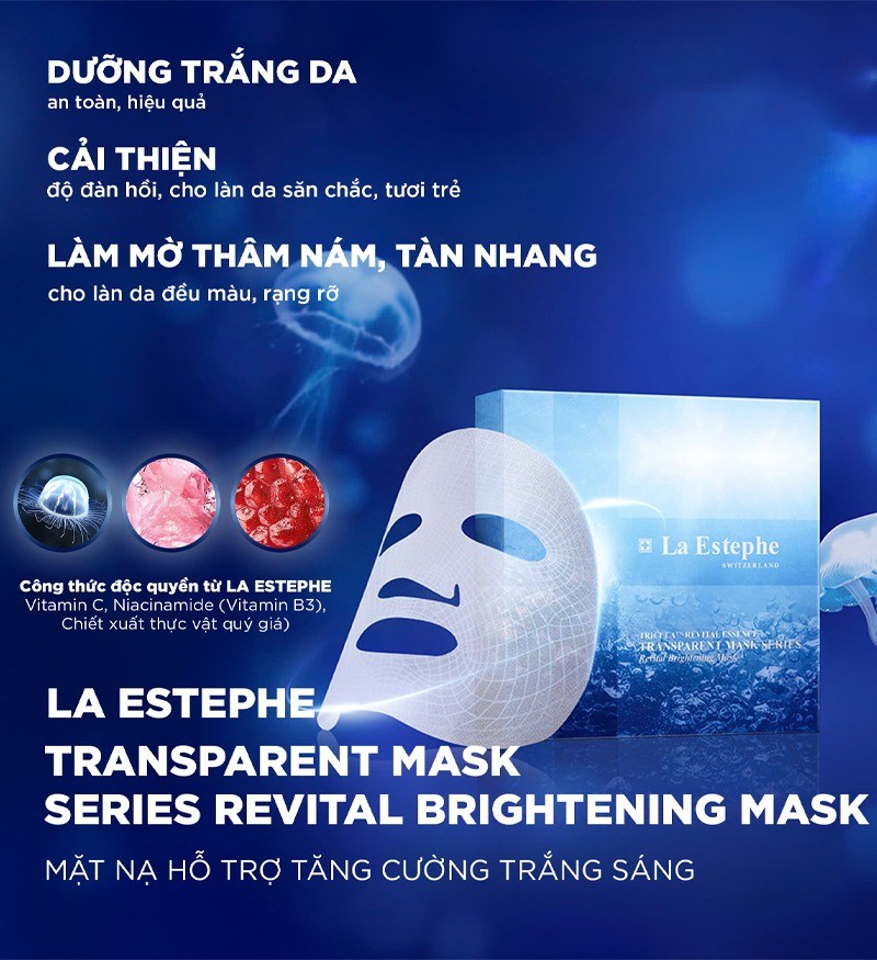 La Estephe Transparent Mask Series Revital Brightening Mask là dòng mặt nạ cao cấp đến từ La Estephe, thương hiệu nổi tiếng trong ngành mỹ phẩm dưỡng da cao cấp. Sản phẩm được nghiên cứu và sản xuất tại Thụy Sĩ, ứng dụng công nghệ tiên tiến giúp dưỡng sáng, cấp ẩm và phục hồi làn da hiệu quả.