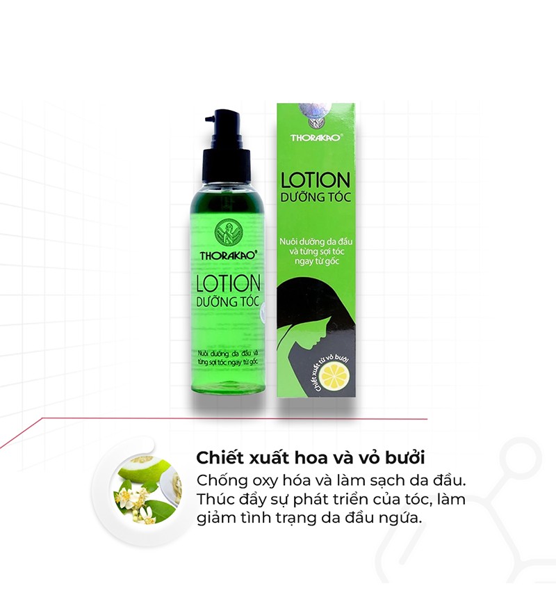 Lotion dưỡng tóc Thorakao tinh chất bưởi là sản phẩm đến từ Việt Nam giúp ngăn ngừa rụng tóc, nuôi dưỡng da đầu, kích thích mọc tóc, đồng thời bảo vệ da đầu khỏi vi khuẩn, nấm và gàu. Với chiết xuất hoa và vỏ bưởi thiên nhiên, sản phẩm mang đến sự dịu nhẹ, không gây kích ứng, giúp mái tóc chắc khỏe và mềm mượt hơn từng ngày.