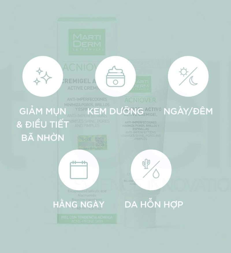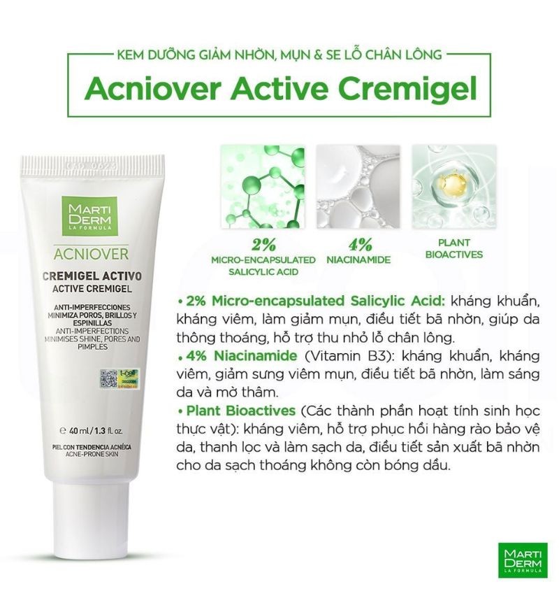 MartiDerm Acniover Active Cremigel là kem dưỡng ngày và đêm chuyên biệt cho da dầu mụn đến từ thương hiệu dược mỹ phẩm MartiDerm (Tây Ban Nha). Sản phẩm ứng dụng công nghệ vi bao (micro-encapsulated) giúp giải phóng Salicylic Acid từ từ, tối ưu hóa khả năng làm sạch lỗ chân lông mà không gây kích ứng. Sự kết hợp cùng Niacinamide nồng độ cao hỗ trợ kháng viêm mạnh mẽ, điều tiết bã nhờn và phục hồi hàng rào bảo vệ da khỏe mạnh.