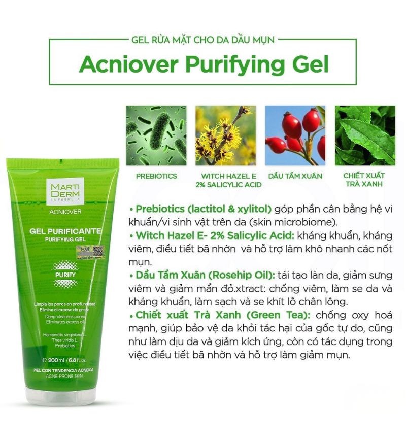 Gel rửa mặt cho da dầu mụn MartiDerm Acniover Purifying Gel 200ml