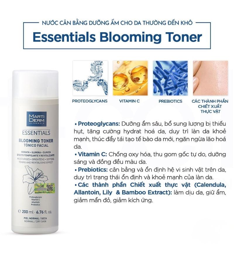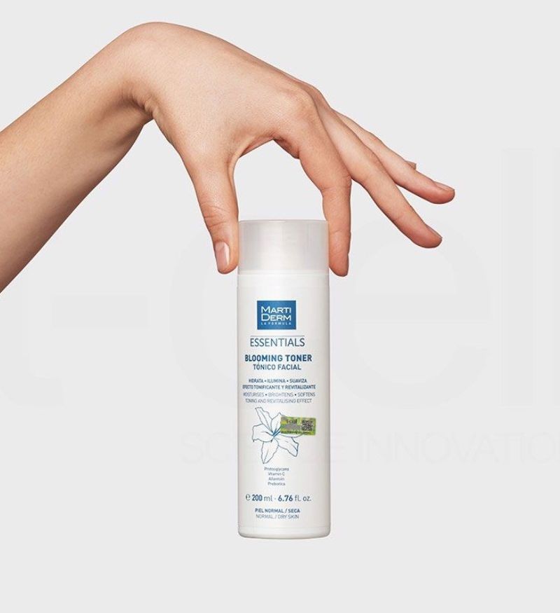 Nước cân bằng dưỡng ẩm Martiderm Essentials Blooming Toner 200ml là "giọt sương" tinh khiết cho làn da thường đến khô, giúp da luôn căng mướt, rạng rỡ như đóa hoa buổi sớm. Sản phẩm đến từ thương hiệu dược mỹ phẩm MartiDerm, thương hiệu nổi tiếng với các dòng sản phẩm chăm sóc da chuyên sâu, đặc biệt là dòng sản phẩm chứa Proteoglycans độc quyền.