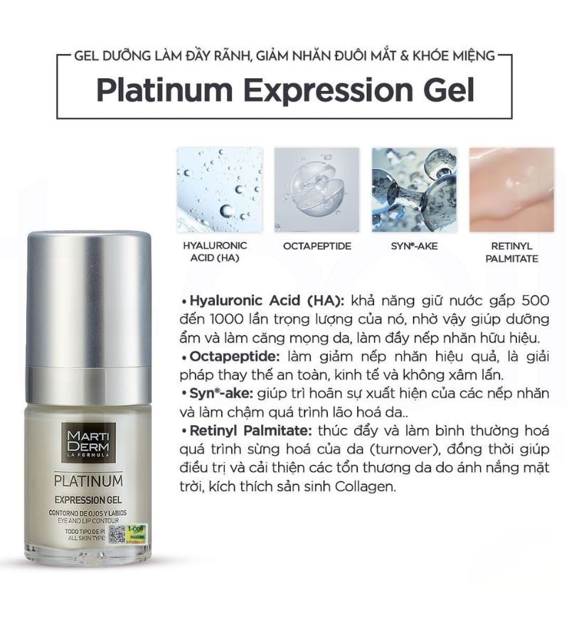 Martiderm Platinum Expression Gel là dòng gel dưỡng chống lão hóa dành riêng cho vùng da quanh mắt và môi nổi tiếng của thương hiệu Martiderm.