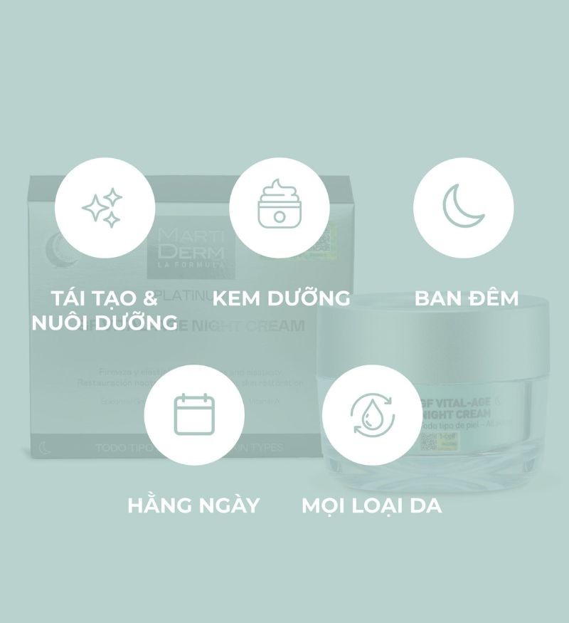 Điểm khác biệt của MartiDerm Platinum GF Vital Age Night Cream là sự kết hợp hoàn hảo giữa các thành phần chất lượng cao và công nghệ tiên tiến, mang lại hiệu quả dưỡng da tối ưu và bảo vệ da trước các tác động từ bên ngoài môi trường.