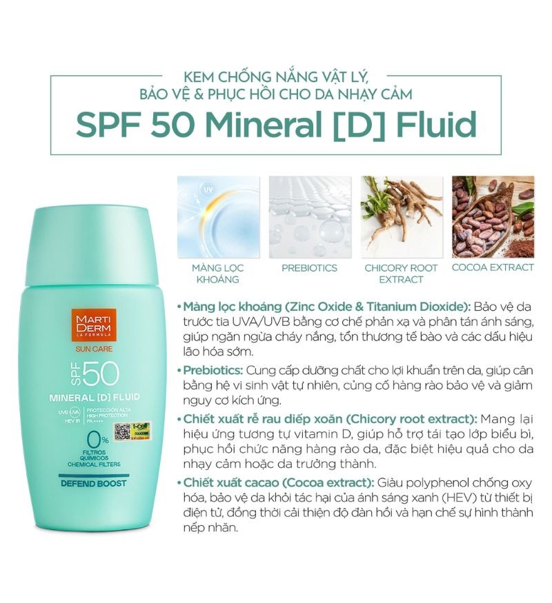 MartiDerm SPF 50 Mineral [D] Fluid là kem chống nắng 100% màng lọc khoáng chất của MartiDerm - thương hiệu dược mỹ phẩm hàng đầu từ Tây Ban Nha, được thiết kế chuyên biệt cho làn da nhạy cảm, dễ kích ứng hoặc đang trong quá trình chăm sóc chuyên sâu. Sản phẩm ứng dụng công nghệ bảo vệ phổ rộng kết hợp cùng hệ dưỡng chất Prebiotics giúp củng cố hàng rào bảo vệ tự nhiên của da.