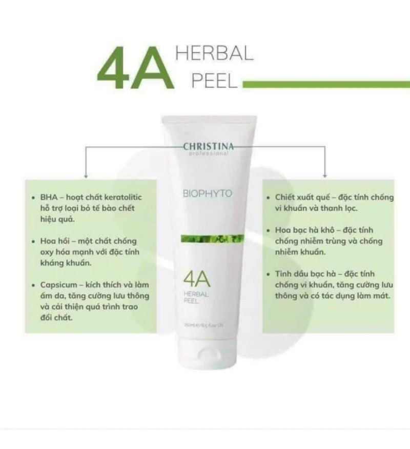 Điểm khác biệt tạo nên sức hút của Christina BioPhyto Herbal Peel chính là công thức làm sạch độc đáo, kết hợp các thành phần thảo dược quý giá như chiết xuất tinh dầu bạc hà, BHA keratolitic, chiết xuất quế, hoa bạc hà, Capsicum và chiết xuất hoa hồi. Sự kết hợp này mang đến hiệu quả làm sạch sâu, kháng khuẩn, chống viêm, dưỡng ẩm và chống lão hóa cho da.