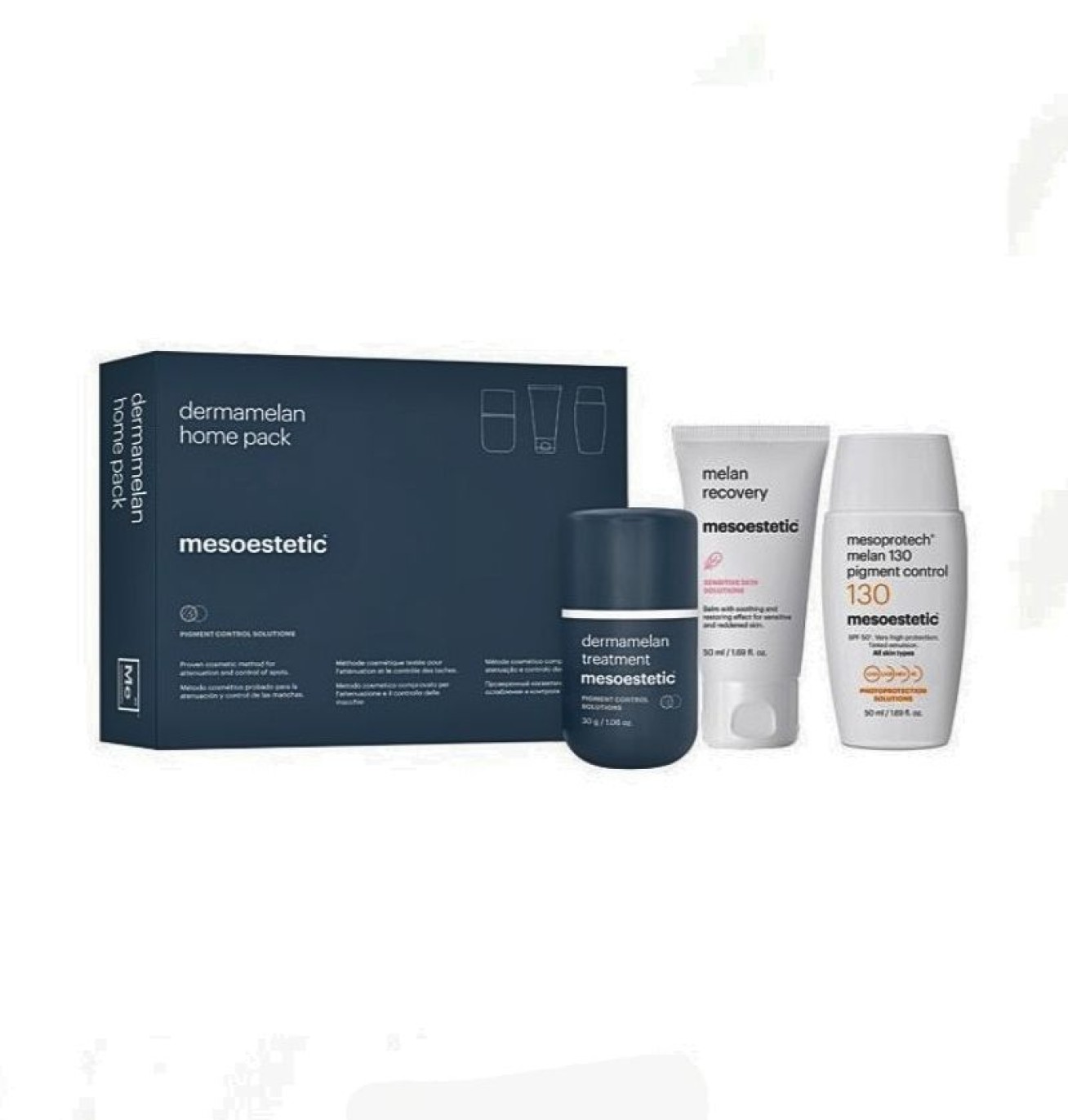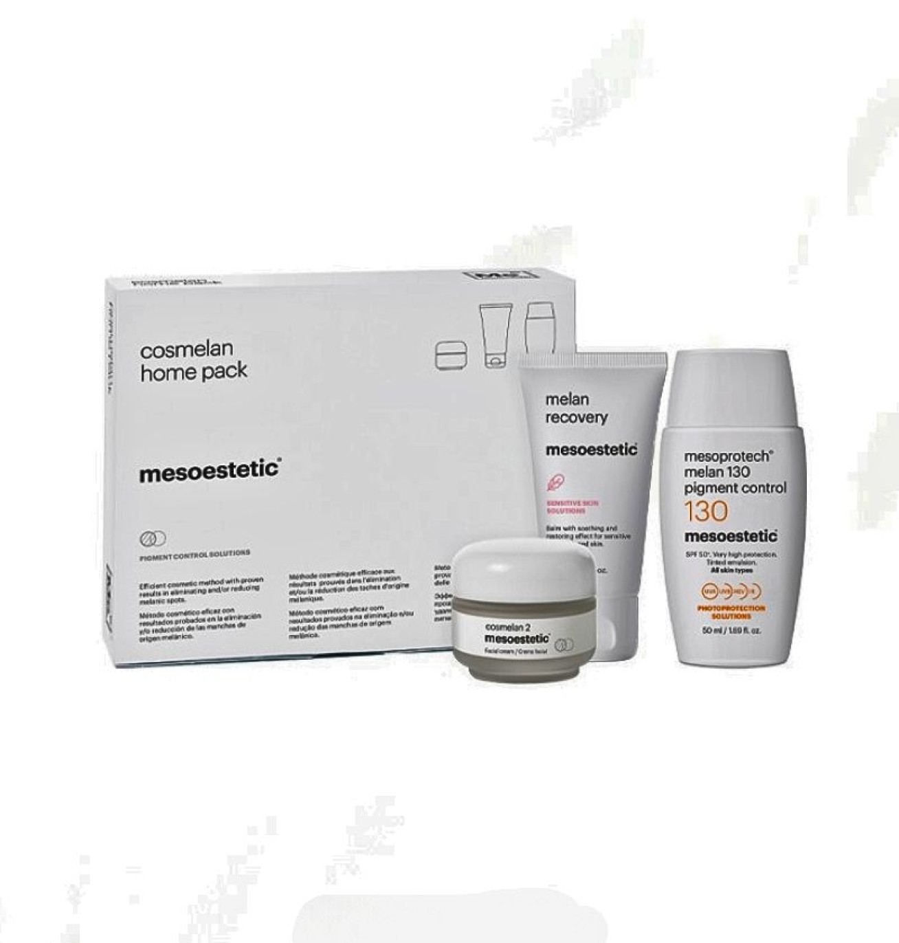 Bộ sản phẩm bao gồm 5 sản phẩm: Dầu làm sạch da Mesoestetic Oil Removing Solution, Mặt nạ trị nám Mesoestetic Cosmelan 1, Kem trị nám Mesoestetic Cosmelan 2, Kem dưỡng làm dịu da Mesoestetic Melan Recovery và Kem chống nắng Mesoestetic Melan 130+ Pigment Control.