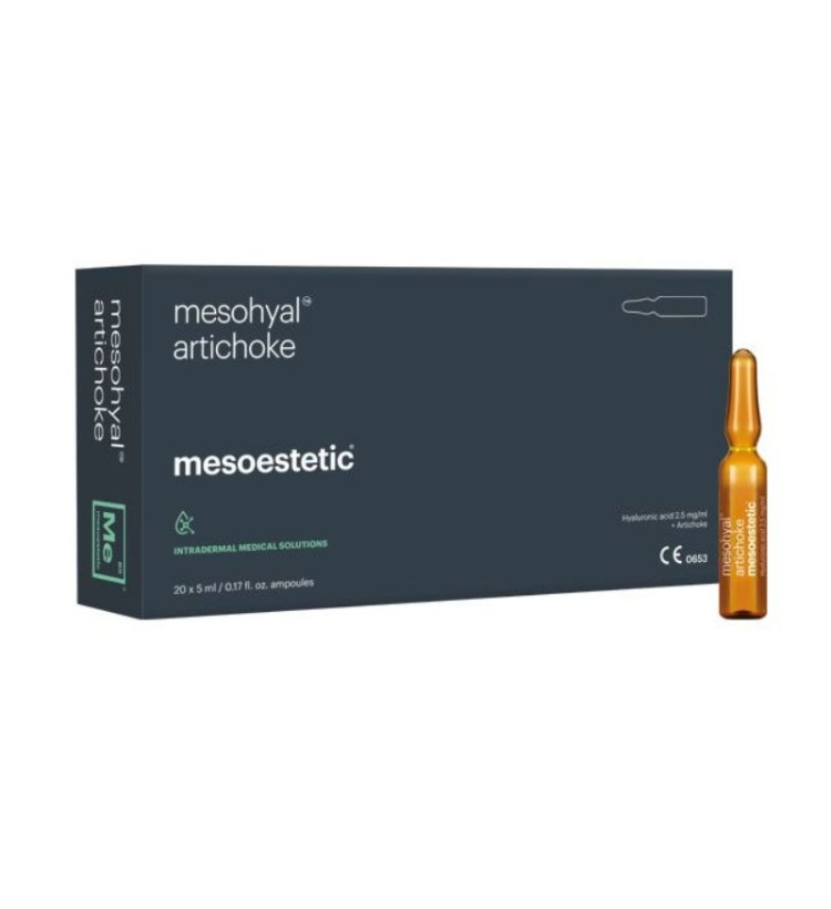 Tinh chất giảm mỡ, trị sần vỏ cam Mesoestetic Mesohyal Artichoke là giải pháp lý tưởng cho làn da sần vỏ cam, mỡ thừa, đến từ thương hiệu dược mỹ phẩm Mesoestetic - Tây Ban Nha. Sản phẩm chứa chiết xuất atiso, muối khoáng và Hyaluronic Acid, giúp giảm mỡ, điều trị sần vỏ cam hiệu quả, đồng thời dưỡng ẩm, chống lão hóa, cho làn da mịn màng, săn chắc.