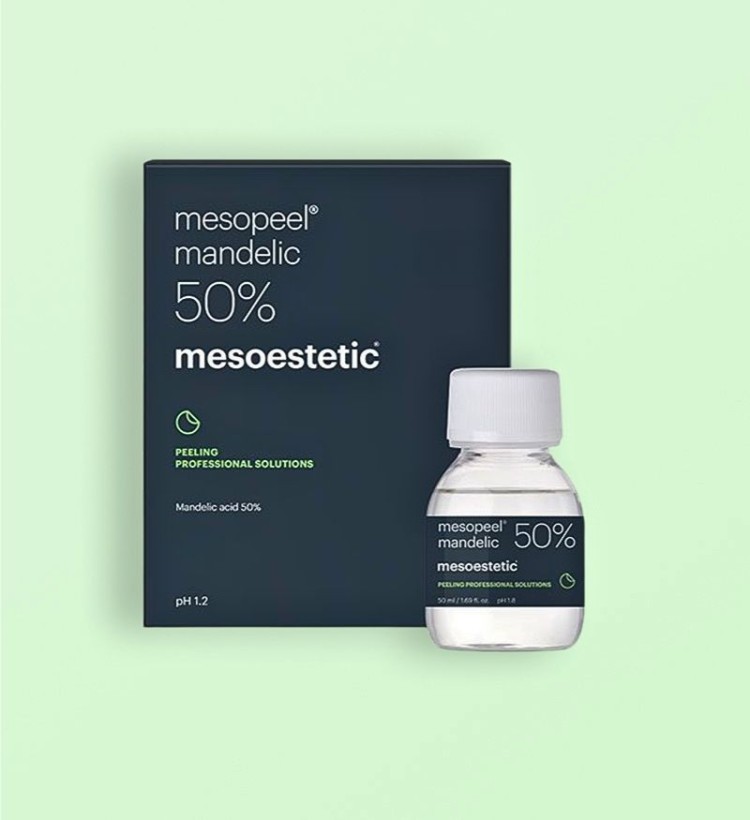 Peel điều trị da lão hóa, tổn thương sắc tố Mesoestetic Mesopeel Mandelic 50% với nồng độ axit mandelic lên đến 50% kích thích tổng hợp collagen và proteoglycan, giúp tẩy tế bào chết nhẹ nhàng, xử lý nếp nhăn, làm mờ thâm nám…giúp làn da trẻ hóa, tươi tắn rạng rỡ. Chỉ 1 liệu trình duy nhất, làn da sẽ lấy lại được sự mịn màng, săn chắc ngoài mong đợi.