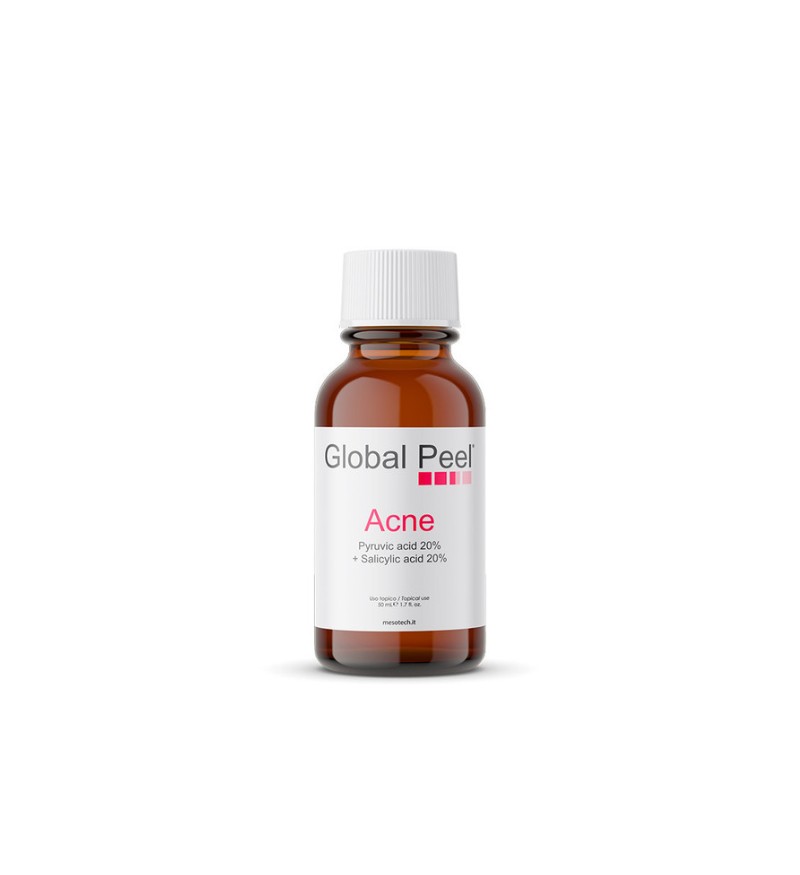 Global Peel Acne từ Mesotech, sản xuất tại Ý, là một sản phẩm peel da chuyên sâu giúp cải thiện mụn trứng cá, mụn viêm và các vấn đề về sắc tố da. Sản phẩm kết hợp hai thành phần chính là Pyruvic Acid 20% và Salicylic Acid 20%, mang lại hiệu quả vượt trội trong việc làm sạch sâu da, giảm mụn và giúp da khỏe mạnh hơn. Global Peel Acne không chỉ làm giảm mụn và sưng tấy mà còn giúp làm sáng da, giảm thâm nám, đem lại làn da sạch sẽ và đều màu hơn.