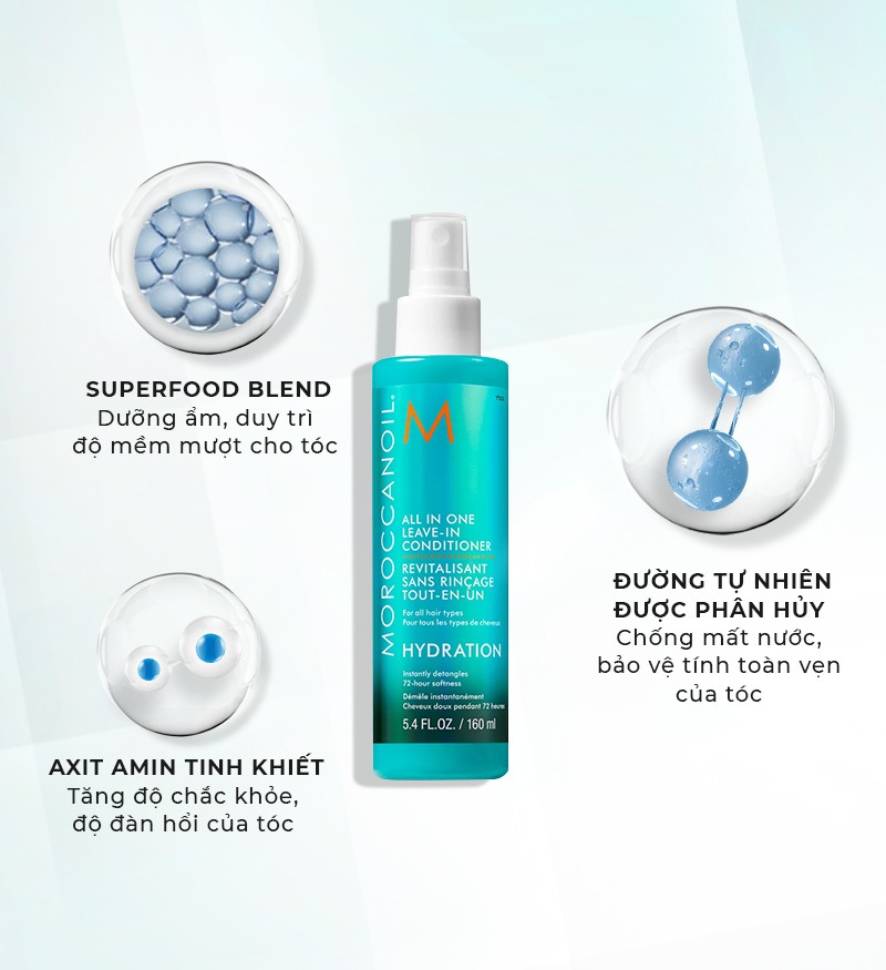 Có thể bạn không tin nhưng tất cả các bước dưỡng, phục hồi và bảo vệ mái tóc đều có trong sản phẩm xịt đa nhiệm này. Moroccanoil All in One Leave-In Conditioner ngay lập tức có thể gỡ rối cho mái tóc, hỗ trợ cấp ẩm, bảo vệ mái tóc khỏi tình trạng gãy rụng, hư tổn do nhiệt. Đồng thời nuôi dưỡng và giữ cho mái tóc bóng mượt, bồng bềnh suốt 72 giờ. Sản phẩm dạng “leave in conditioner” như kiểu dầu xả không cần xả lại với nước. Vì không dùng chất tạo mùi nhân tạo nên sản phẩm có mùi hương tự nhiên rất dễ chịu khi sử dụng.