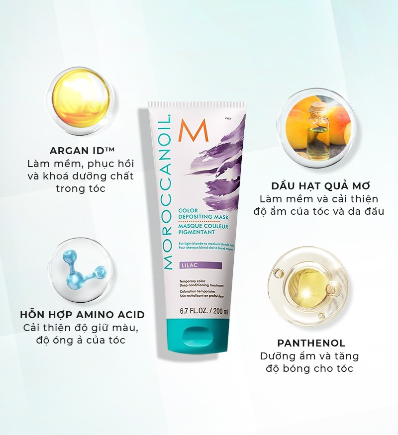 Moroccanoil Color Depositing Mask bổ sung những hạt màu thuần đồng thời cung cấp những dưỡng chất cho tóc như một loại mặt nạ dưỡng tóc sâu chứa Argan ID™, hỗn hợp Amino Acid Dầu Hạt Quả Mơ (Apricot Kernel Oil), Protein đậu nành thuỷ phân (Hydrolyzed Soy Protein), Panthenol. Không chỉ tăng ánh sắc, làm mới những màu nhuộm đã có trên tóc, hoặc cho phép người dùng được thử nghiệm những màu sắc thời thượng, cá tính. Sản phẩm còn dưỡng ẩm, phục hồi độ bóng mượt, chắc khỏe cho mái tóc.