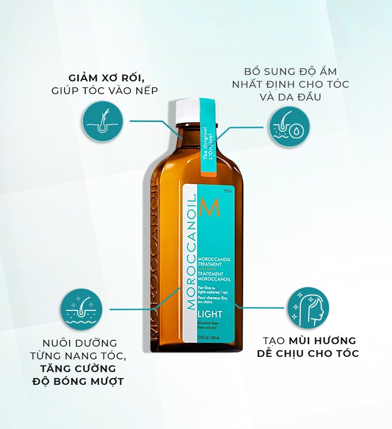 Công thức chứa các vitamin, protein và dầu Argan tồn tại dưới dạng phân tử siêu nhỏ giàu chất chống oxy hóa. Phương pháp dưỡng tóc mang tính cách mạng này giảm nhanh tình trạng xơ rối, tăng cường độ chắc khỏe, óng ả cho mái tóc. Moroccanoil Treatment Light còn có khả năng phục hồi tóc hư tổn do quá trình tẩy, nhuộm, sử dụng hóa chất nhiều.