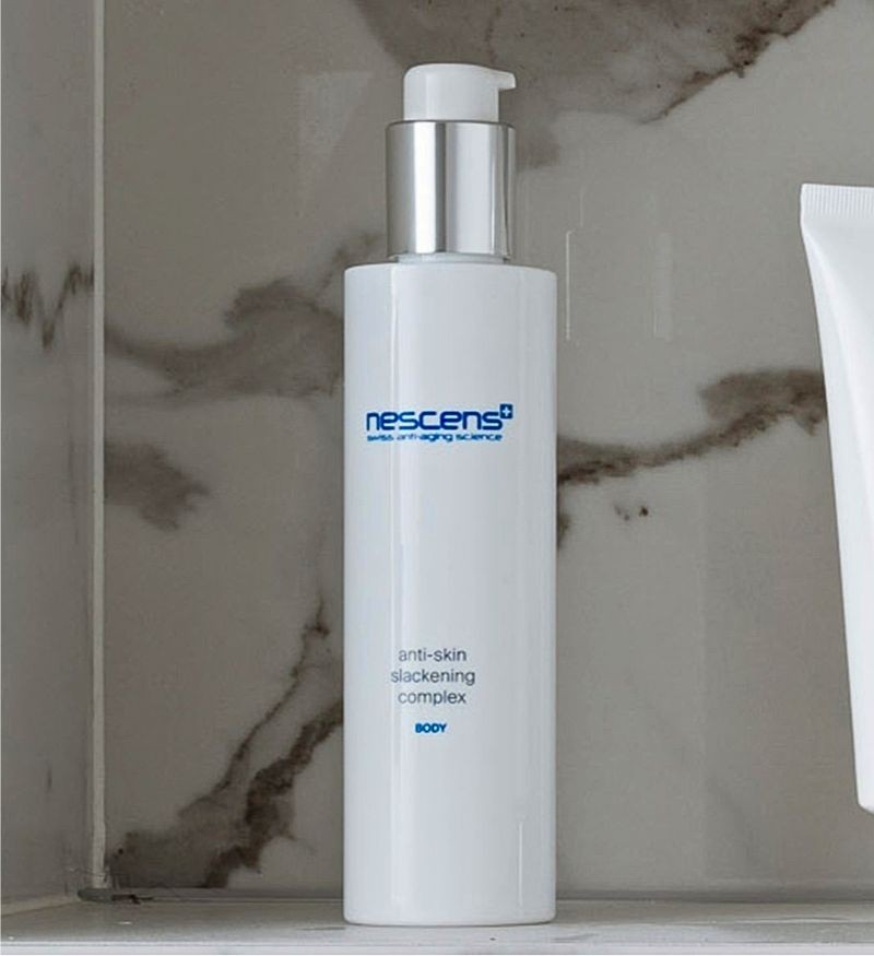 Nescens đã phát triển một loại dưỡng chất phức hợp giúp trẻ hoá tổng thể cấu trúc da, ngăn ngừa và cân bằng sự chùng nhão, cải thiện sự đàn hồi của các mô mang tên Nescens Anti-Skin Slackening Complex - Body. Nescens Anti-Skin Slackening Complex kết hợp tính hiệu dụng của dược mỹ phẩm dưới dạng công thức galenic được bào chế ở thể lỏng với khả năng hấp thụ và thẩm thấu tối ưu. Giúp nhanh chóng cung cấp dưỡng chất cho các lớp tế bào da. Kết cấu kem mịn nhẹ, thẩm thấu nhanh không gây bết dính, bít tắc. Từ đó, phục hồi hiệu quả khả năng tái cấu trúc những dấu hiệu tuổi tác đặc trưng của mô da: sự đàn hồi, màu da, độ mềm mại, thư thái và rạng rỡ. Nuôi dưỡng làn da mềm mịn, chắc khỏe từ sâu bên trong.