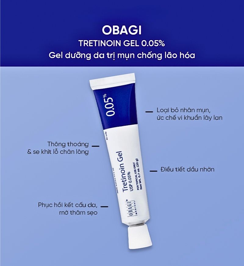Obagi Tretinoin Gel 0.05% là dòng gel trị mụn chống lão hóa rất được ưa chuộng hiện nay của hãng dược mỹ phẩm danh tiếng Mỹ – Obagi Medical. Sản phẩm tích cực trong việc điều trị mụn, giúp triệt tiêu mụn, làm mờ vết thâm mụn hiệu quả. Đồng thời phát huy tác dụng cải thiện nếp nhăn, giảm thiểu các dấu hiệu lão hóa da như nám, tàn nhang…