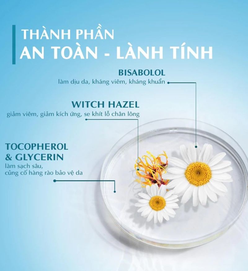 Đằng sau hiệu quả của sản phẩm là sự kết hợp của các thành phần có khả năng làm sạch và bảo vệ da. Tocopherol (một dạng của Vitamin E) và Glycerin là hai hoạt chất chính, nổi tiếng với đặc tính chống oxy hóa cao. Chúng giúp bảo vệ toàn vẹn hàng rào tự nhiên của da, đồng thời cấp ẩm chuyên sâu, duy trì sự cân bằng và tránh tình trạng khô căng sau khi rửa mặt. Sự hiện diện của các thành phần như Bisabolol và Chiết xuất lá cây phỉ càng làm tăng thêm đặc tính làm dịu và kháng khuẩn của sản phẩm, giúp da trở nên khỏe mạnh và ít bị tổn thương hơn.