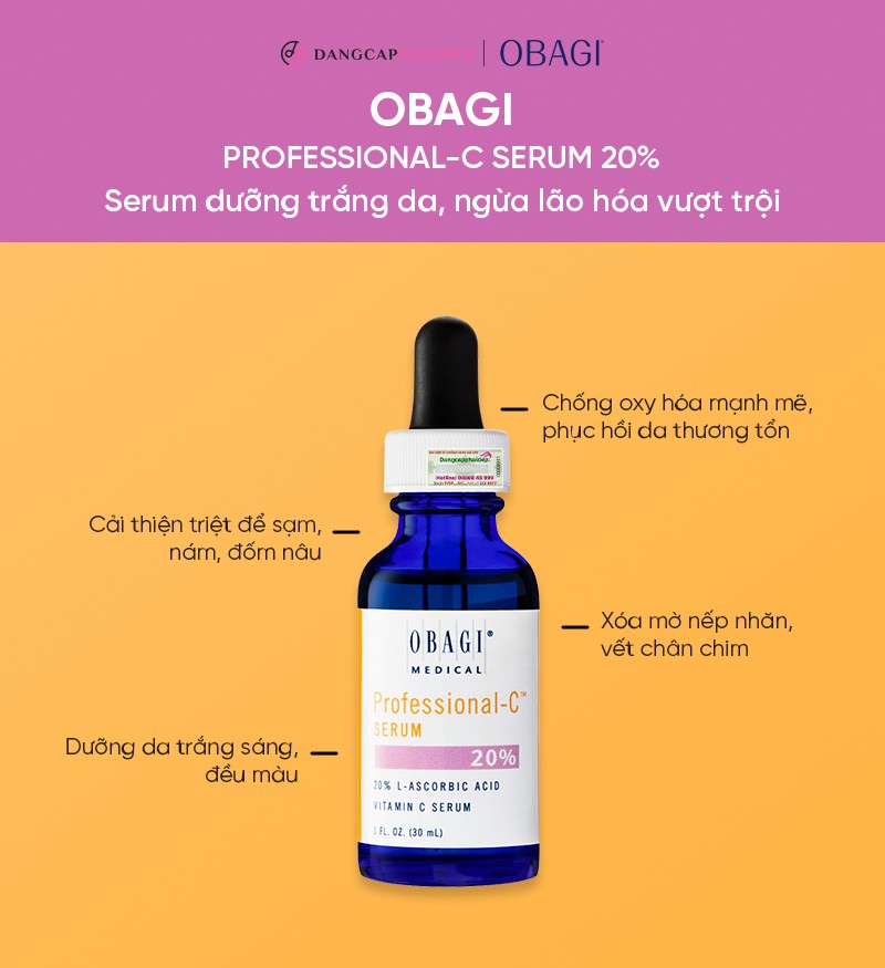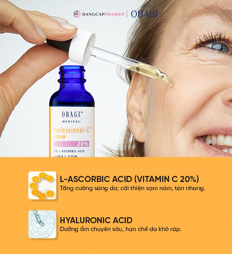 Serum dưỡng trắng, ngừa lão hóa Obagi Professional-C Serum 20% 30ml là sản phẩm chăm sóc da chuyên sâu đến từ thương hiệu dược mỹ phẩm Obagi Medical - Mỹ, nổi tiếng với các giải pháp trị nám, mụn và lão hóa da hiệu quả. Sản phẩm sở hữu kết cấu dạng serum lỏng nhẹ, thẩm thấu nhanh vào da, không gây bết dính.