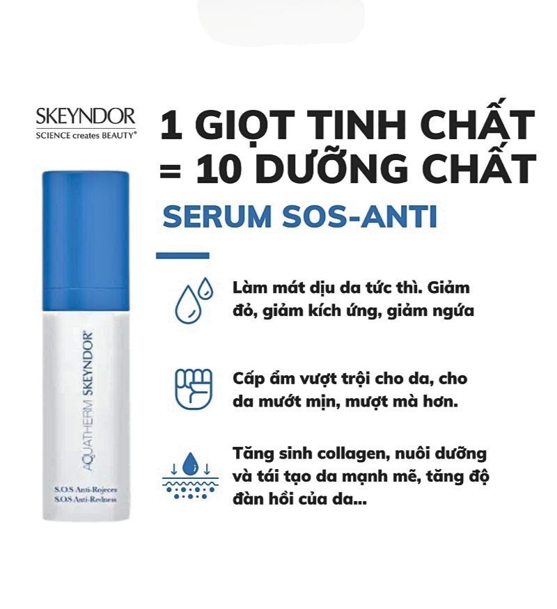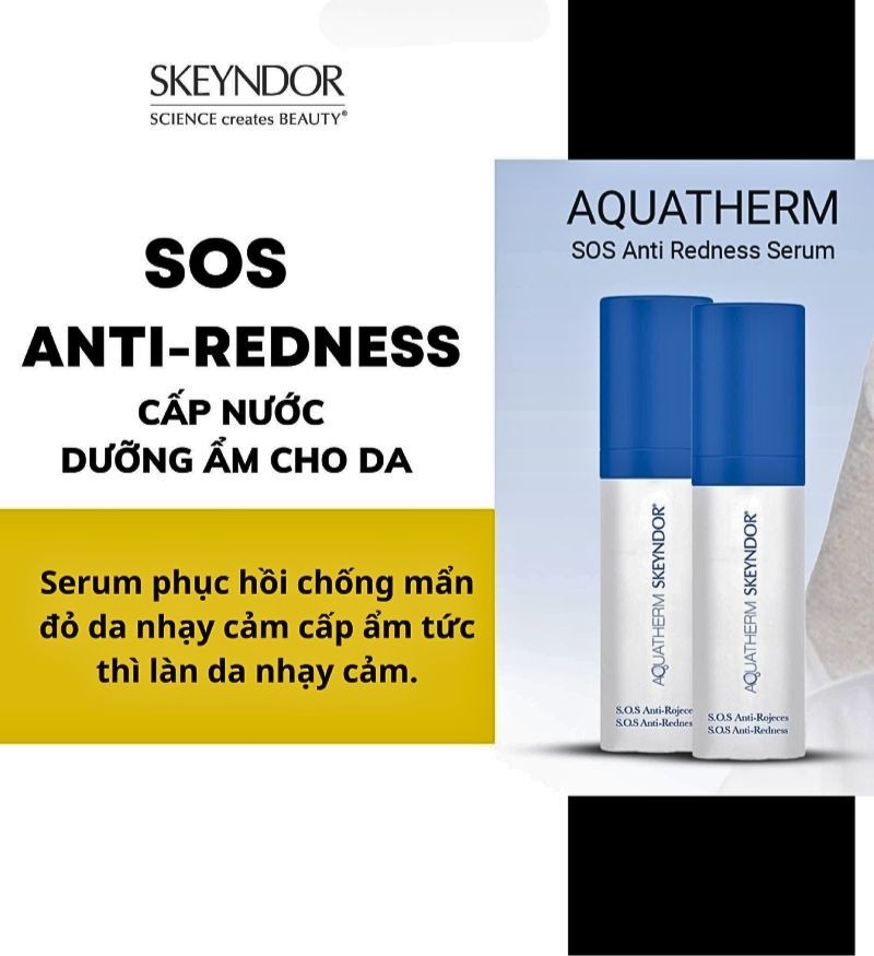 Skeyndor SOS Anti - Redness là một phần của dòng chăm sóc da nhạy cảm Aquatherm thuộc thương hiệu Skeyndor. Với thành phần dồi dào vitamin và khoáng chất, serum này sẽ giúp bạn hỗ trợ làn da hàng ngày trong việc kiểm soát sự nhạy cảm của da, bất kể nguyên nhân đến từ đâu. Ngay khi tác động lên da, các dưỡng chất sẽ lập tức làm dịu đi các kích ứng, mẩn đỏ khó chịu. Đồng thời, tăng cường phục hồi tổn thương và đẩy mạnh quá trình tái tạo da. Cũng như bảo vệ chống oxy hóa giúp giảm thiểu viêm và thiệt hại do căng thẳng oxy hóa hàng ngày. Từ đó, giúp làn da luôn ở trong trạng thái khỏe khoắn, tươi mới.